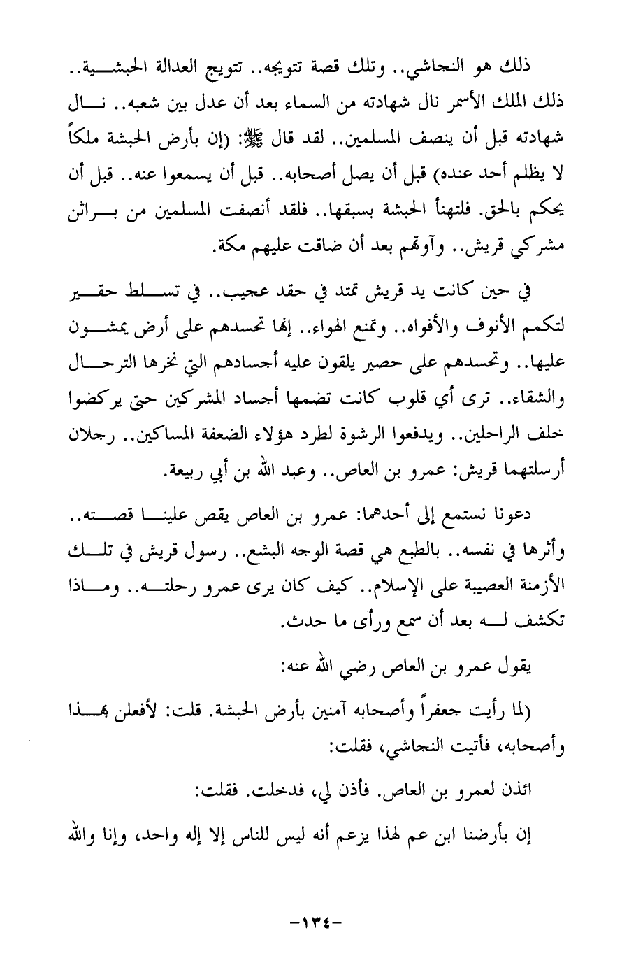 في حين كانت يد قريش تمتد في حقد عجيب .. في تسلط حقير لتكمم الأنوف والأفواه .. وتمنع الهواء .. إنها تحسدهم على أرض يمشون عليها .. وتحسدهم على حصير يلقون عليه أجسادهم التي نخرها الترحال والشقاء .. ترى أي قلوب كانت تضمها أجساد المشركين حتى يركضوا خلف الراحلين .. ويدفعوا الرشوة لطرد هؤلاء الضعفة المساكين .. رجلان أرسلتهما قريش: عمرو بن العاص .. وعبد الله بن أبي ربيعة.