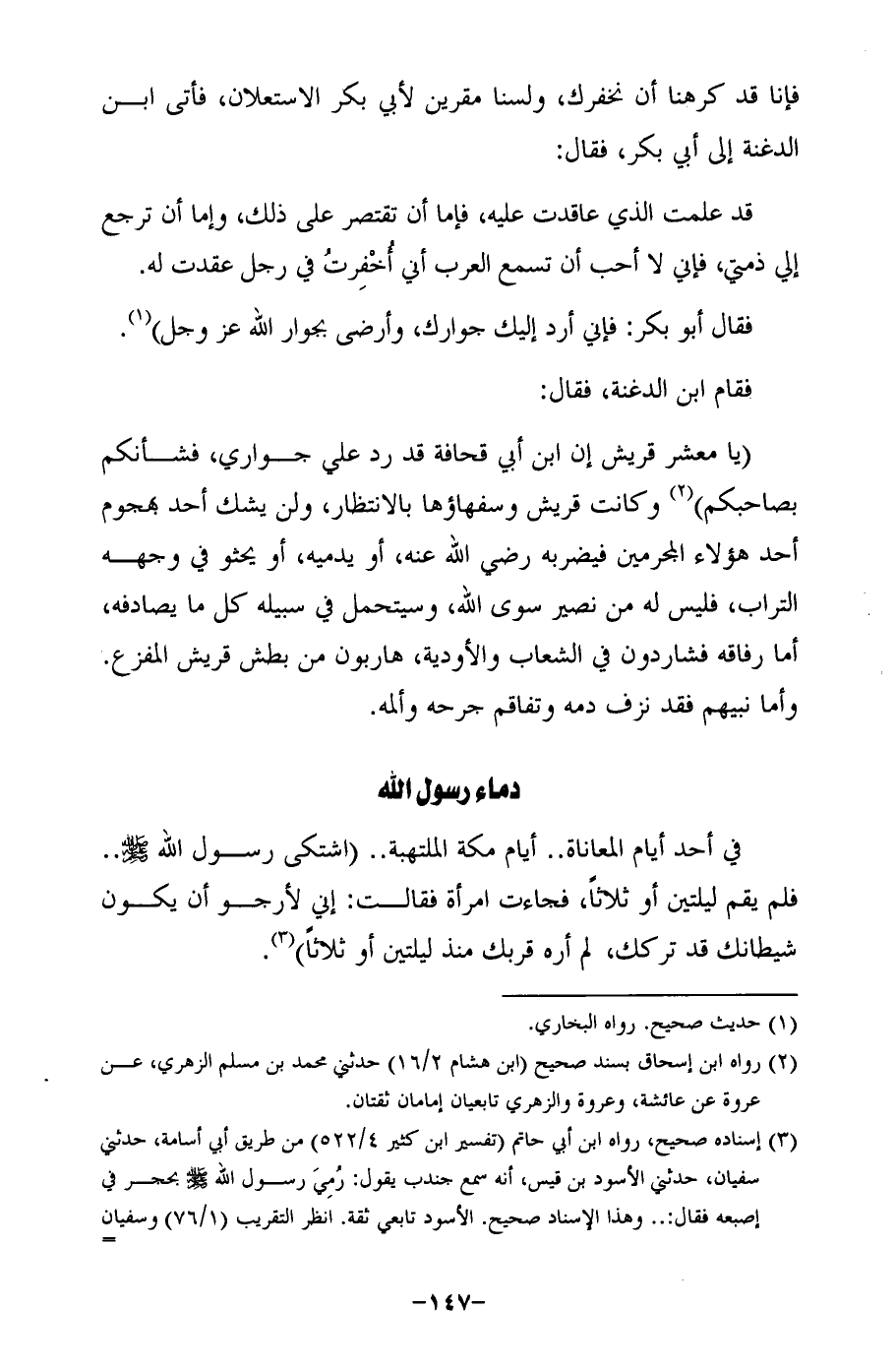 فإنا قد كرهنا أن نخفرك، ولسنا مقرين لأبي بكر الاستعلان، فأتى ابن الدغنة إلى أبي بكر، فقال: