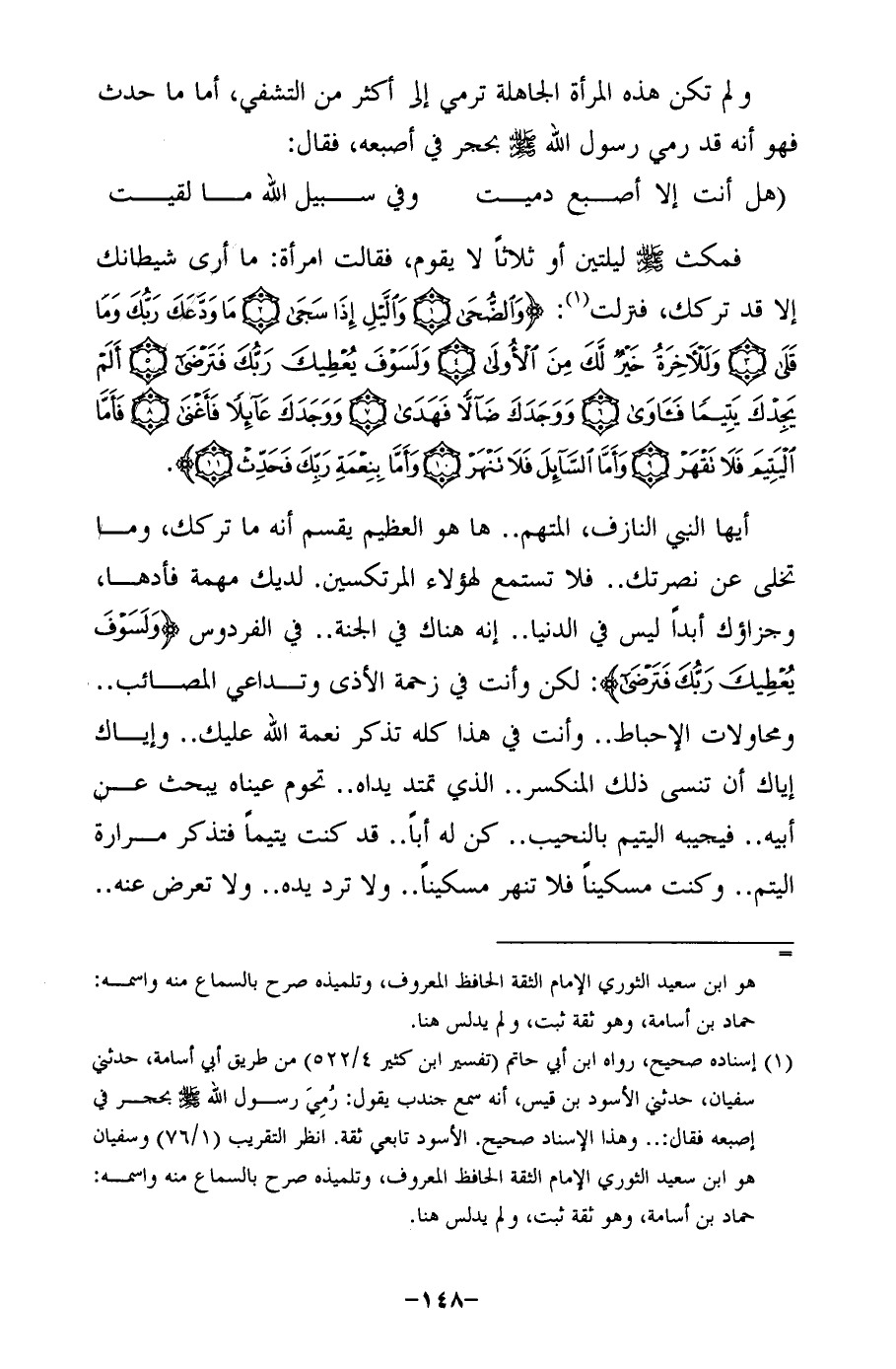 فمكث صلى الله عليه وسلم ليلتين أو ثلاثًا لا يقوم، فقالت امرأة: ما أرى شيطانك إلا قد تركك، فنزلت (¬1): {وَالضُّحَى (1) وَاللَّيْلِ إِذَا سَجَى (2) مَا وَدَّعَكَ رَبُّكَ وَمَا قَلَى (3) وَلَلْآخِرَةُ خَيْرٌ لَكَ مِنَ الْأُولَى (4) وَلَسَوْفَ يُعْطِيكَ رَبُّكَ فَتَرْضَى (5) أَلَمْ يَجِدْكَ يَتِيمًا فَآوَى (6) وَوَجَدَكَ ضَالًّا فَهَدَى (7) وَوَجَدَكَ عَائِلًا فَأَغْنَى (8) فَأَمَّا الْيَتِيمَ فَلَا تَقْهَرْ (9) وَأَمَّا السَّائِلَ فَلَا تَنْهَرْ (10) وَأَمَّا بِنِعْمَةِ رَبِّكَ فَحَدِّثْ (11)}.