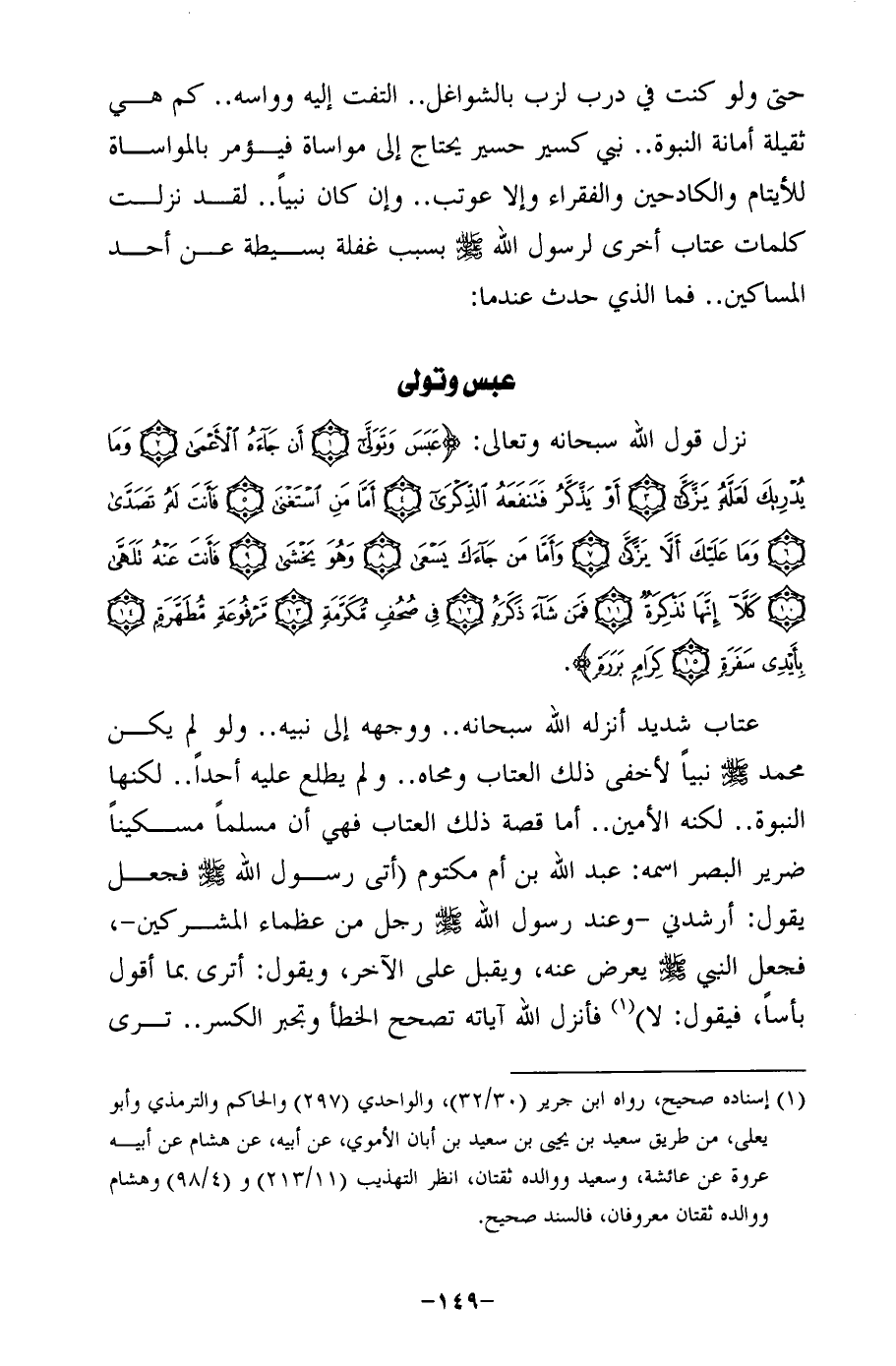 نزل قول الله سبحانه وتعالى: {عبَسَ وَتَوَلَّى (1) أَنْ جَاءَهُ الْأَعْمَى (2) وَمَا يُدْرِيكَ لَعَلَّهُ يَزَّكَّى (3) أَوْ يَذَّكَّرُ فَتَنْفَعَهُ الذِّكْرَى (4) أَمَّا مَنِ اسْتَغْنَى (5) فَأَنْتَ لَهُ تَصَدَّى (6) وَمَا عَلَيْكَ أَلَّا يَزَّكَّى (7) وَأَمَّا مَنْ جَاءَكَ يَسْعَى (8) وَهُوَ يَخْشَى (9) فَأَنْتَ عَنْهُ تَلَهَّى (10) كَلَّا إِنَّهَا تَذْكِرَةٌ (11) فَمَنْ شَاءَ ذَكَرَهُ (12) في صُحُفٍ مُكَرَّمَةٍ (13) مَرْفُوعَةٍ مُطَهَّرَةٍ (14) بِأَيْدِي سَفَرَةٍ (15) كِرَامٍ بَرَرَةٍ}