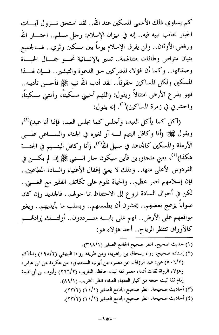 كم يساوي ذلك الأعمى المسكن عند الله .. لقد استحق نزول آيات الجبار تعاتب نبيه فيه .. إنه في ميزان الإِسلام: رجل مسلم .. اختار الله ورفض الأوثان .. ولن يفرق الإِسلام يومًا بين مسكين وثري .. فالجميع بنيان متراص وطاقات متناغمة .. تسير بالإنسانية نحو جمال الحياة وصفائها .. وكما أن لهؤلاء المشركين حق الدعوة والتبشير .. فإن لهذا المسكين ولكل المساكين حقوقًا .. لقد أدب الله نبيه صلى الله عليه وسلم فأحسن تأديبه .. فهو يذرع الأرض امتثالًا ويقول: (اللَّهم أحيني مسكينًا، وأمتني مسكينًا، واحشرني في زمرة المساكن) (¬1). إنه يقول: