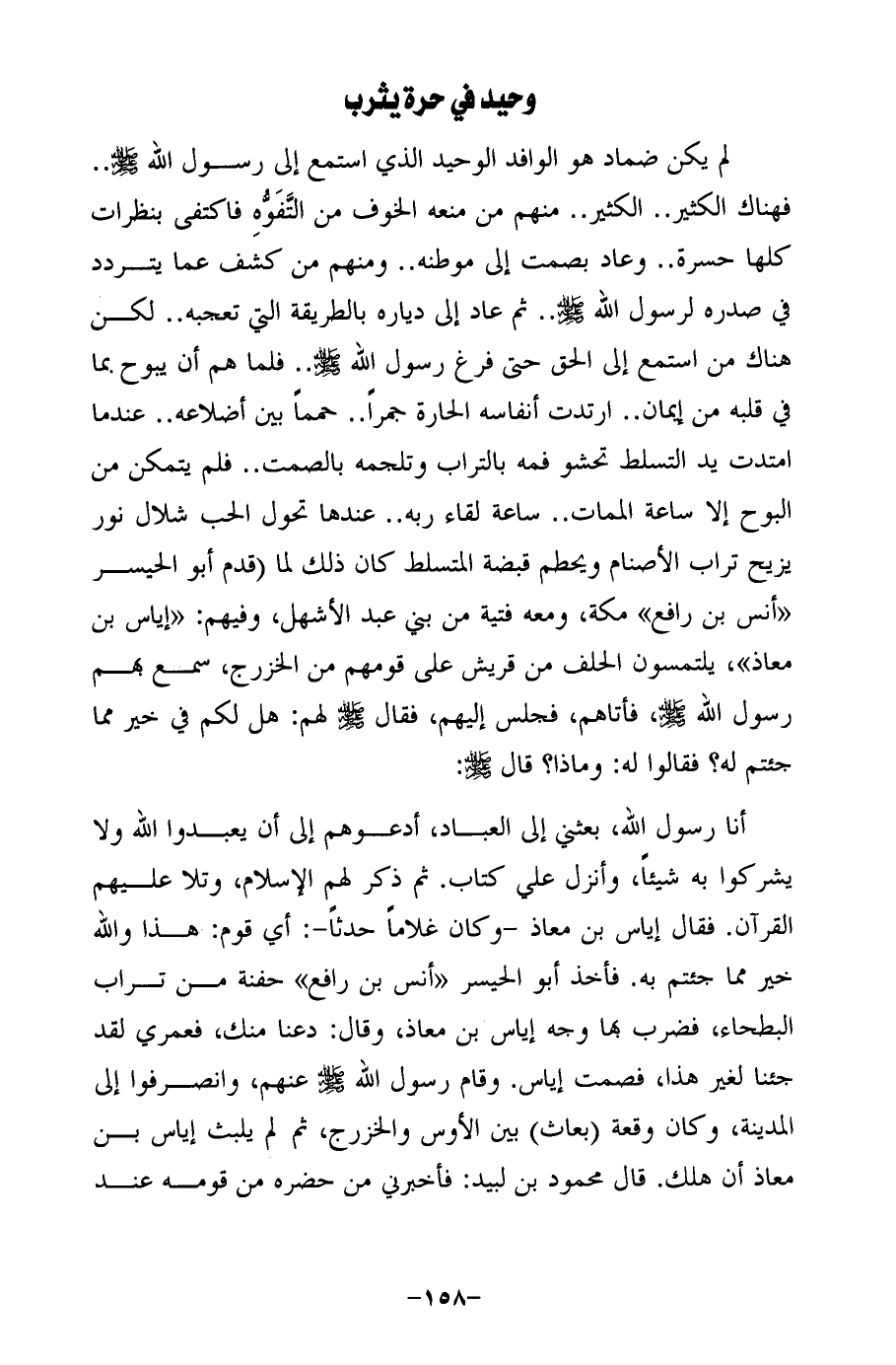 أنا رسول الله، بعثني إلى العباد، أدعوهم إلى أن يعبدوا الله ولا يشركوا به شيئًا، وأنزل علي كتاب. ثم ذكر لهم الإِسلام، وتلا عليهم القرآن. فقال إياس بن معاذ -كان غلامًا حدثًا-: أي قوم: هذا والله خير مما جئتم به. فأخذ أبو الحيسر "أنس بن رافع" حفنة من تراب البطحاء، فضرب بها وجه إياس بن معاذ، وقال: دعنا منك، فعمري لقد جئنا لغير هذا، فصمت إياس. وقام رسول الله -صلى الله عليه وسلم -، عنهم، وانصرفوا إلى المدينة، وكان وقعة (بعاث) بين الأوس والخزرج، ثم لم يلبث إياس بن معاذ أن هلك. قال محمود بن لبيد: فأخبرني من حضره من قومه عند
