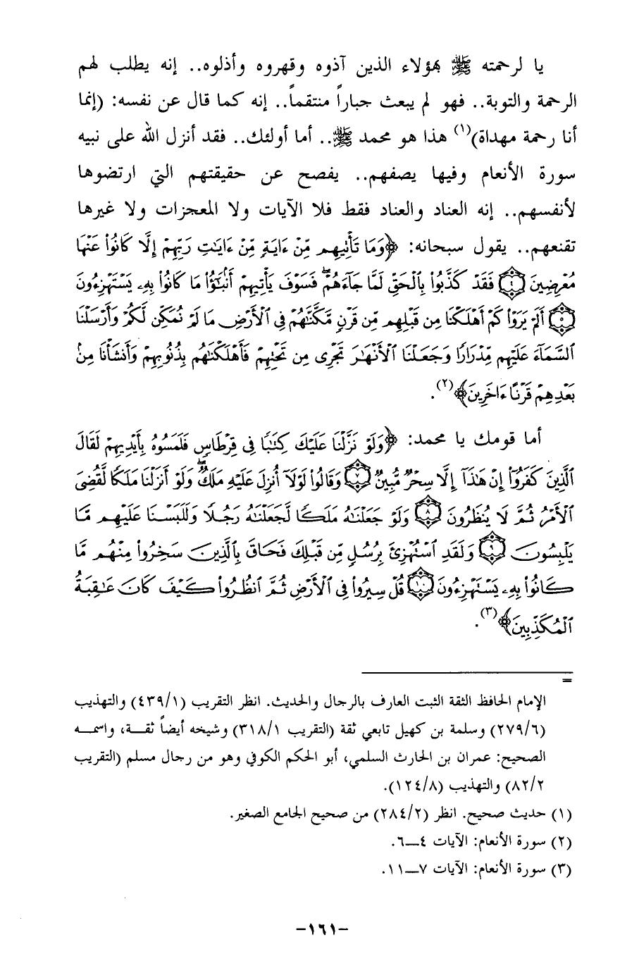 يا لرحمته - صلى الله عليه وسلم - بهؤلاء الذين آذوه وقهروه وأذلوه .. إنه يطلب لهم الرحمة والتوبة .. فهو لم يبعث جبارًا منتقمًا .. إنه كما قال عن نفسه: (إنما أنا رحمة مهداة) (¬1) هذا هو محمَّد - صلى الله عليه وسلم - .. أما أولئك .. فقد أنزل الله على نبيه سورة الأنعام وفيها يصفهم .. يفصح عن حقيقتهم التي ارتضوها لأنفسهم .. إنه العناد والعناد فقط فلا الآيات ولا المعجزات ولا غيرها تقنعهم .. يقول سبحانه: {وَمَا تَأْتِيهِمْ مِنْ آيَةٍ مِنْ آيَاتِ رَبِّهِمْ إِلَّا كَانُوا عَنْهَا مُعْرِضِينَ (4) فَقَدْ كَذَّبُوا بِالْحَقِّ لَمَّا جَاءَهُمْ فَسَوْفَ يَأْتِيهِمْ أَنْبَاءُ مَا كَانُوا بِهِ يَسْتَهْزِئُونَ (5) أَلَمْ يَرَوْا كَمْ أَهْلَكْنَا مِنْ قَبْلِهِمْ مِنْ قَرْنٍ مَكَّنَّاهُمْ فِي الْأَرْضِ مَا لَمْ نُمَكِّنْ لَكُمْ وَأَرْسَلْنَا السَّمَاءَ عَلَيْهِمْ مِدْرَارًا وَجَعَلْنَا الْأَنْهَارَ تَجْرِي مِنْ تَحْتِهِمْ فَأَهْلَكْنَاهُمْ بِذُنُوبِهِمْ وَأَنْشَأْنَا مِنْ بَعْدِهِمْ قَرْنًا آخَرِينَ} (¬2).