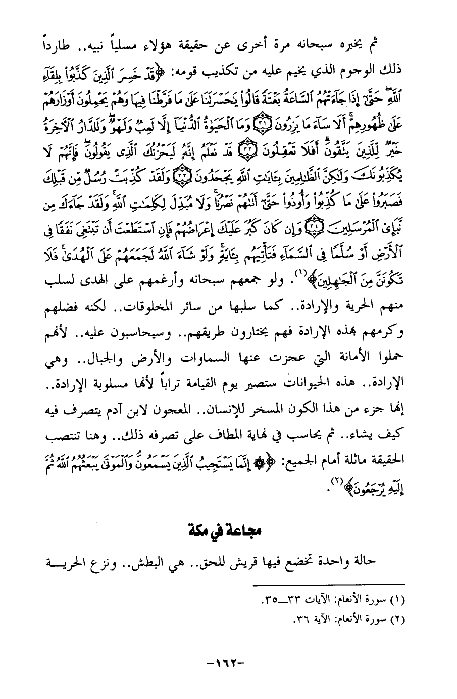 ثم يخبره سبحانه مرة أخرى عن حقيقة هؤلاء مسليًا نبيه .. طاردًا ذلك الوجوم الذي يخيم عليه من تكذيب قوله: {قَدْ خَسِرَ الَّذِينَ كَذَّبُوا بِلِقَاءِ اللَّهِ حَتَّى إِذَا جَاءَتْهُمُ السَّاعَةُ بَغْتَةً قَالُوا يَا حَسْرَتَنَا عَلَى مَا فَرَّطْنَا فِيهَا وَهُمْ يَحْمِلُونَ أَوْزَارَهُمْ عَلَى ظُهُورِهِمْ أَلَا سَاءَ مَا يَزِرُونَ (31) وَمَا الْحَيَاةُ الدُّنْيَا إِلَّا لَعِبٌ وَلَهْوٌ وَلَلدَّارُ الْآخِرَةُ خَيْرٌ لِلَّذِينَ يَتَّقُونَ أَفَلَا تَعْقِلُونَ (32) قَدْ نَعْلَمُ إِنَّهُ لَيَحْزُنُكَ الَّذِي يَقُولُونَ فَإِنَّهُمْ لَا يُكَذِّبُونَكَ وَلَكِنَّ الظَّالِمِينَ بِآيَاتِ اللَّهِ يَجْحَدُونَ (33) وَلَقَدْ كُذِّبَتْ رُسُلٌ مِنْ قَبْلِكَ فَصَبَرُوا عَلَى مَا كُذِّبُوا وَأُوذُوا حَتَّى أَتَاهُمْ نَصْرُنَا وَلَا مُبَدِّلَ لِكَلِمَاتِ اللَّهِ وَلَقَدْ جَاءَكَ مِنْ نَبَإِ الْمُرْسَلِينَ (34) وَإِنْ كَانَ كَبُرَ عَلَيْكَ إِعْرَاضُهُمْ فَإِنِ اسْتَطَعْتَ أَنْ تَبْتَغِيَ نَفَقًا فِي الْأَرْضِ أَوْ سُلَّمًا فِي السَّمَاءِ فَتَأْتِيَهُمْ بِآيَةٍ وَلَوْ شَاءَ اللَّهُ لَجَمَعَهُمْ عَلَى الْهُدَى فَلَا تَكُونَنَّ مِنَ الْجَاهِلِينَ} (¬1). ولو جمعهم سبحانه وأرغمهم على الهدى لسلب منهم الحرية والإرادة .. كما سلبها من سائر المخلوقات .. لكنه فضلهم وكرمهم بهذه الإرادة فهم يختارون طريقهم .. وسيحاسبون عليه .. لأنهم حملوا الأمانة التي عجزت عنها السماوات والأرض والجبال .. وهي الإرادة .. هذه الحيوانات ستصير يوم القيامة ترابًا لأنها مسلوبة الإرادة .. إنها جزء من هذا الكون المسخر للإنسان .. المعجون لابن آدم يتصرف فيه كيف يشاء .. ثم يحاسب في نهاية المطاف على تصرفه ذلك .. وهنا تنتصب الحقيقة ماثلة أمام الجميع: {إِنَّمَا يَسْتَجِيبُ الَّذِينَ يَسْمَعُونَ وَالْمَوْتَى يَبْعَثُهُمُ اللَّهُ ثُمَّ إِلَيْهِ يُرْجَعُونَ} (¬2).