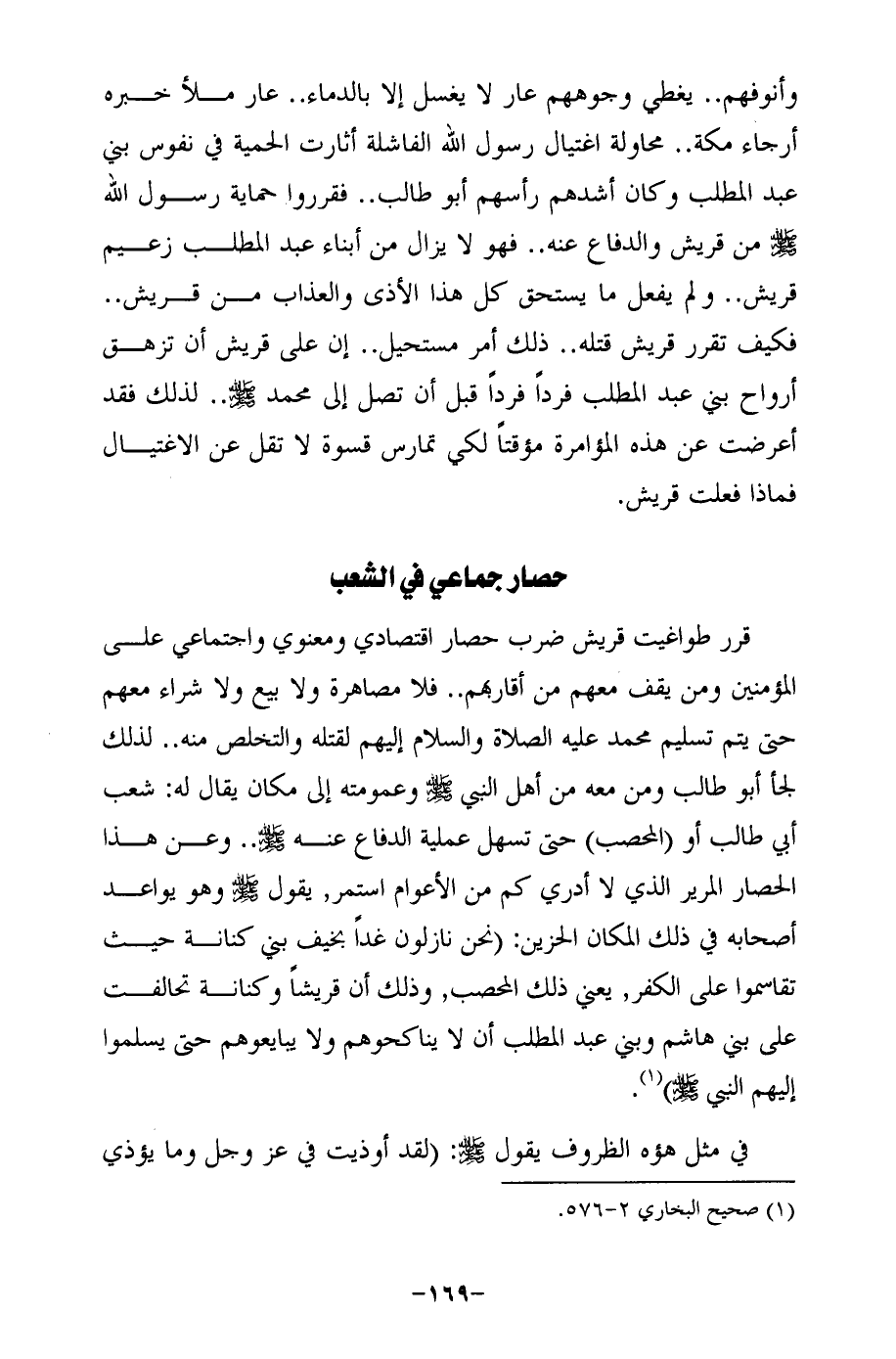 وأنوفهم .. يغطى وجوههم عار لا يغسل إلا بالدماء .. عار ملأ خبره أرجاء مكة .. محاولة اغتيال رسول الله الفاشلة أثارت الحمية في نفوس بني عبد المطلب وكان أشدهم رأسهم أبو طالب .. فقرروا حماية رسول الله - صلى الله عليه وسلم - من قريش والدفاع عنه .. فهو لا يزال من أبناء عبد المطلب زعيم قريش .. ولم يفعل ما يستحق كل هذا الأذى والعذاب من قريش .. فكيف تقرر قريش قتله .. ذلك أمر مستحيل .. إن على قريش أن تزهق أرواح بي عبد المطلب فردًا فردًا قبل أن تصل إلى محمَّد - صلى الله عليه وسلم - .. لذلك فقد أعرضت عن هذه المؤامرة مؤقتًا لكي تمارس قسوة لا تقل عن الاغتيال فماذا فعلت قريش.