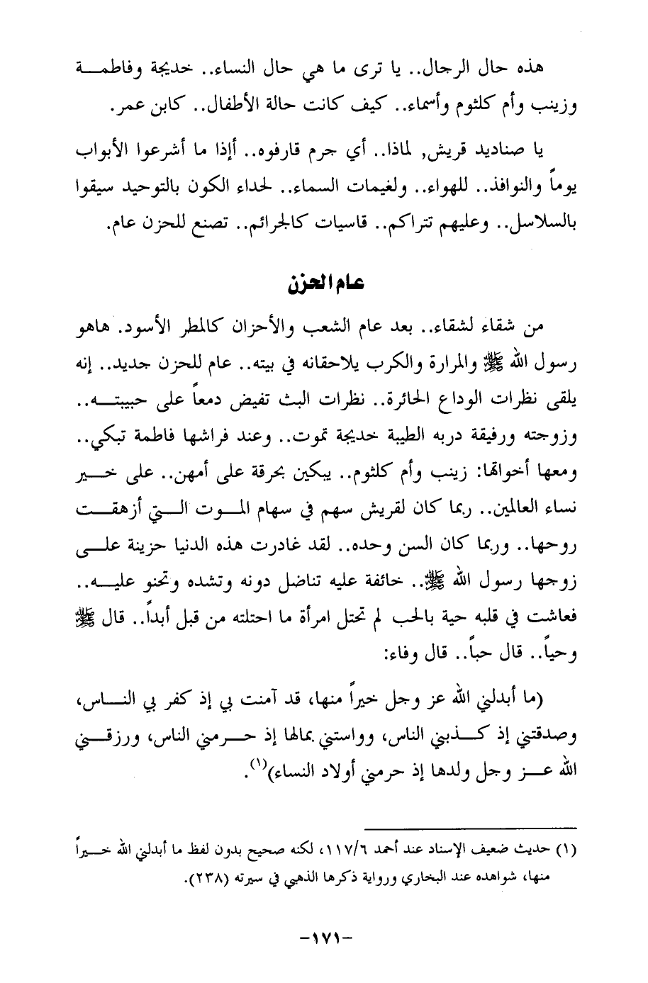 من شقاء لشقاء .. بعد عام الشعب والأحزان كالمطر الأسود. ها هو رسول الله - صلى الله عليه وسلم - والمرارة والكرب يلاحقانه في بيته .. عام للحزن جديد .. إنه يلقى نظرات الوداع الحائرة .. نظرات البث تفيض دمعًا على حبيبته .. وزوجته ورفيقة دربه الطيبة خديجة تموت .. وعند فراشها فاطمة تبكي .. ومعها أخواتها: زينب وأم كلثوم .. يبكين بحرقة على أمهن .. على خير نساء العالمين .. ربما كان لقريش سهم في سهام الموت التي أزهقت روحها .. وربما كان السن وحده .. لقد غادرت هذه الدنيا حزينة على زوجها رسول الله - صلى الله عليه وسلم - .. خائفة عليه تناضل دونه وتشده وتحنو عليه .. فعاشت في قلبه حية بالحب لم تحتل امرأة ما احتلته من قبل أبدًا .. قال - صلى الله عليه وسلم - وحيًا .. قال حبًا .. قال وفاء: