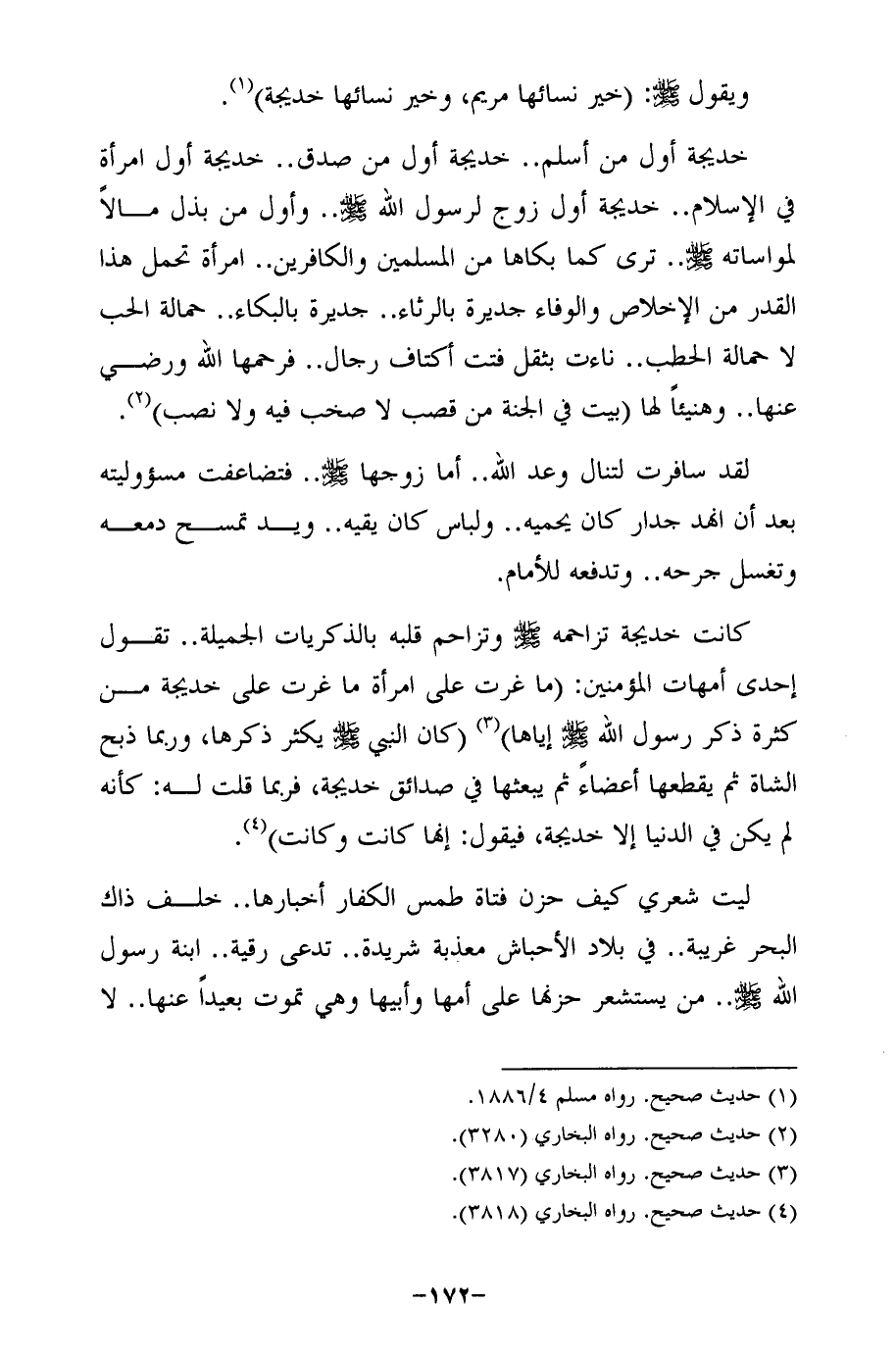 خديجة أول من أسلم .. خديجة أول من صدق .. خديجة أول امرأة في الإِسلام .. خديجة أول زوج لرسول الله -صلى الله عليه وسلم - .. وأول من بذل مالًا لمواساته - صلى الله عليه وسلم - .. ترى كما بكاها من المسلمين والكافرين .. امرأة تحمل هذا القدر من الإخلاص والوفاء جديرة بالرثاء .. جديرة بالبكاء .. حمالة الحب لا حمالة الحطب .. ناءت بثقل فتت أكتاف رجال .. فرحمها الله ورضي عنها .. وهنيئًا لها (بيت في الجنة من قصب لا صخب فيه ولا نصب) (¬2).