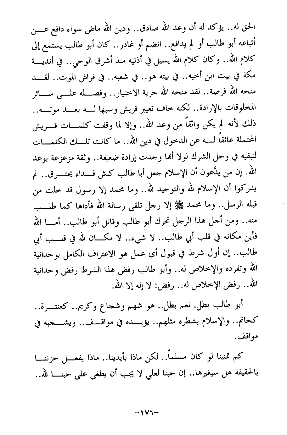 الحق له .. يؤكد له أن وعد الله صادق .. ودين الله ماض سواء دافع عن أتباعه أبو طالب أو لم يدافع .. انضم أو غادر .. كان أبو طالب يستمع إلى كلام الله .. وكان كلام الله يسيل في أذنيه منذ أشرق الوحي .. في أندية مكة في بيت ابن أخيه .. في بيته هو .. في شعبه .. في فراش الموت .. لقد منحه الله فرصة .. لقد منحه الله حرية الاختيار .. وفضله على سائر المخلوقات بالإرادة .. لكنه خاف تعيير قريش وسبها له بعد موته .. ذلك لأنه لم يكن واثقًا من وعد الله .. وإلا لما وقفت كلمات قريش المحتملة عائقًا له عن الدخول في دين الله .. ما كانت تلك الكلمات لتبقيه في وحل الشرك لولا أنها وجدت إرادة ضعيفة .. وثقة مزعزعة بوعد الله. إن من يدَّعون أن الإِسلام جعل أبا طالب كبش فداء يحترق .. لم يدركوا أن الإِسلام لله والتوحيد لله .. وما محمَّد إلا رسول قد خلت من قبله الرسل .. وما محمَّد - صلى الله عليه وسلم - إلا رجل تلقى رسالة الله فأداها كما طلب منه .. ومن أجل هذا الرجل تحرك أبو طالب وقاتل أبو طالب .. أما الله فأين مكانه في قلب أبي طالب .. لا شيء .. لا مكان لله في قلب أبي طالب .. إن أول شرط في قبول أي عمل هو الاعتراف الكامل بوحدانية الله وتفرده والإخلاص له .. وأبو طالب رفض هذا الشرط رفض وحدانية الله .. رفض الإخلاص له .. رفض: لا إله إلا الله.