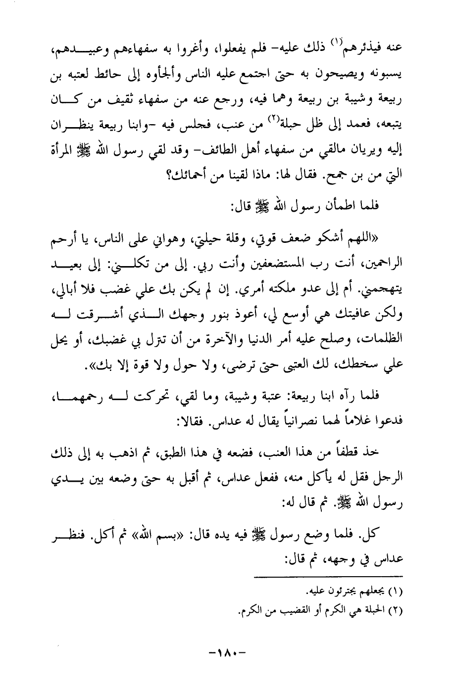 فلما رآه ابنا ربيعة: عتبة وشيبة، وما لقي، تحركت له رحمهما، فدعوا غلامًا لهما نصرانيًا يقال له عداس. فقالا: