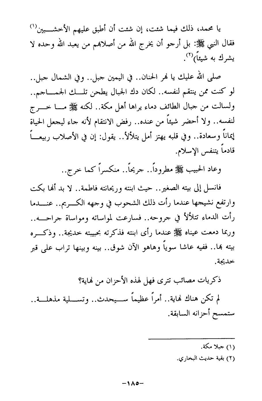صلى الله عليك يا نهر الحنان .. في اليمين جبل .. وفي الشمال جبل .. لو كنت ممّن ينتقم لنفسه .. لكان دك الجبال يطحن تلك الجماجم .. ولسالت من جبال الطائف دماء يراها أهل مكة .. لكنه - صلى الله عليه وسلم - ما خرج لنفسه .. ولا أحضر شيئًا من عنده .. رفض الانتقام لأنه جاء ليجعل الحياة إيمانًا وسعادة .. وفي قلبه يهتز أمل يتلألأ .. يقول: إن في الأصلاب ربيعًا قادمًا يتنفس الإِسلام.