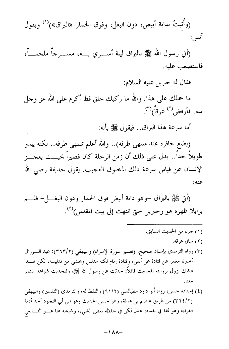 (أتي - صلى الله عليه وسلم - بالبراق -وهو دابة أبيض فوق الحمار ودون البغل- فلم يزايلا ظهره هو وجبريل حتى انتهت إلى بيت المقدس) (¬4).