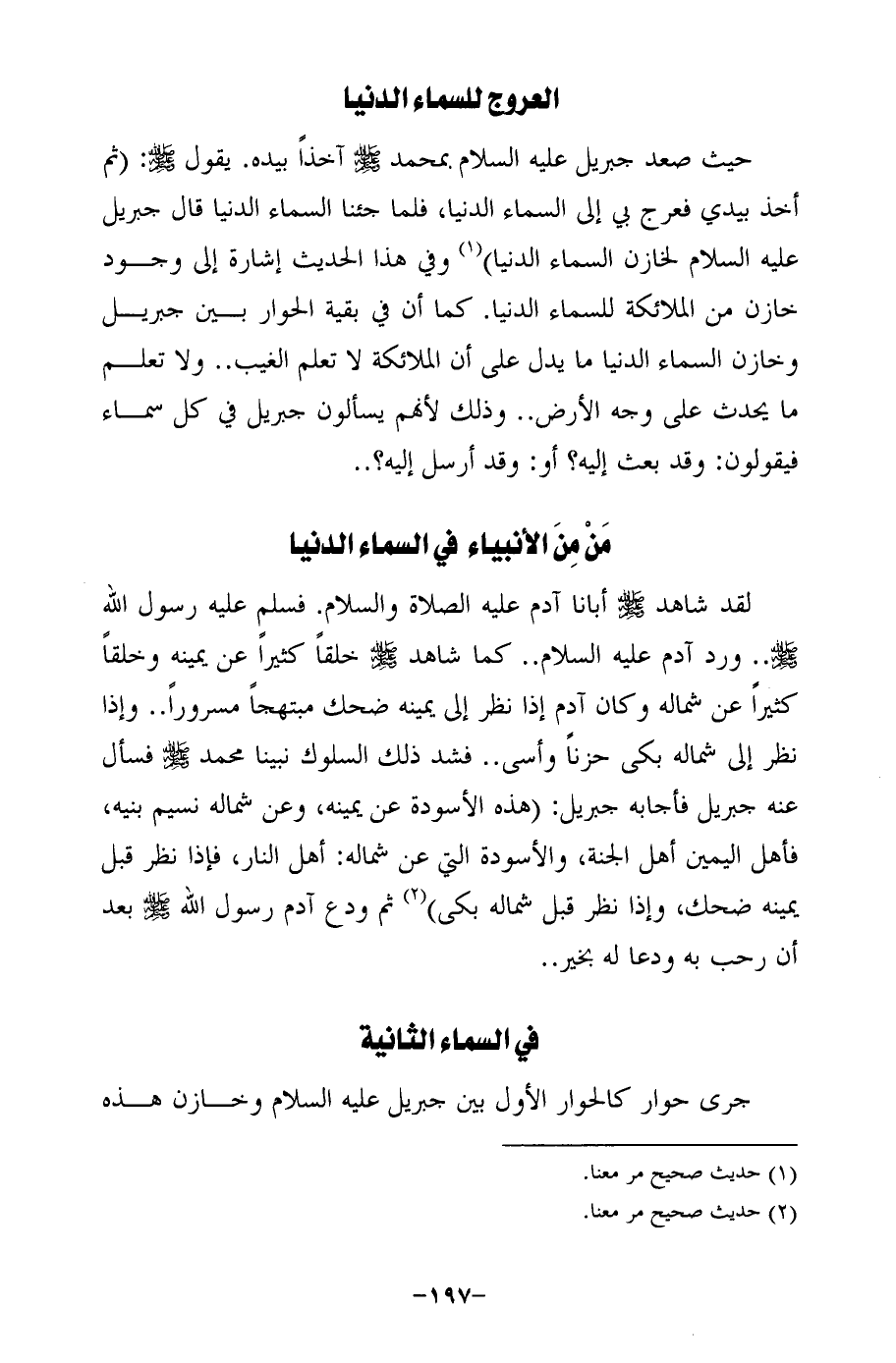 حيث صعد جبريل عليه السلام بمحمد - صلى الله عليه وسلم - آخذًا بيده. يقول - صلى الله عليه وسلم -: (ثم أخذ بيدي فعرج بي إلى السماء الدنيا، فلما جئنا السماء الدنيا قال جبريل عليه السلام لخازن السماء الدنيا) (¬1) وفي هذا الحديث إشارة إلى وجود خازن من الملائكة للسماء الدنيا. كما أن في بقية الحوار بين جبريل وخازن السماء الدنيا ما يدل على أن الملائكة لا تعلم الغيب .. ولا تعلم ما يحدث على وجه الأرض .. وذلك لأنهم يسألون جبريل في كل سماء فيقولون: وقد بعث إليه؟ أو: وقد أرسل إليه؟ ..