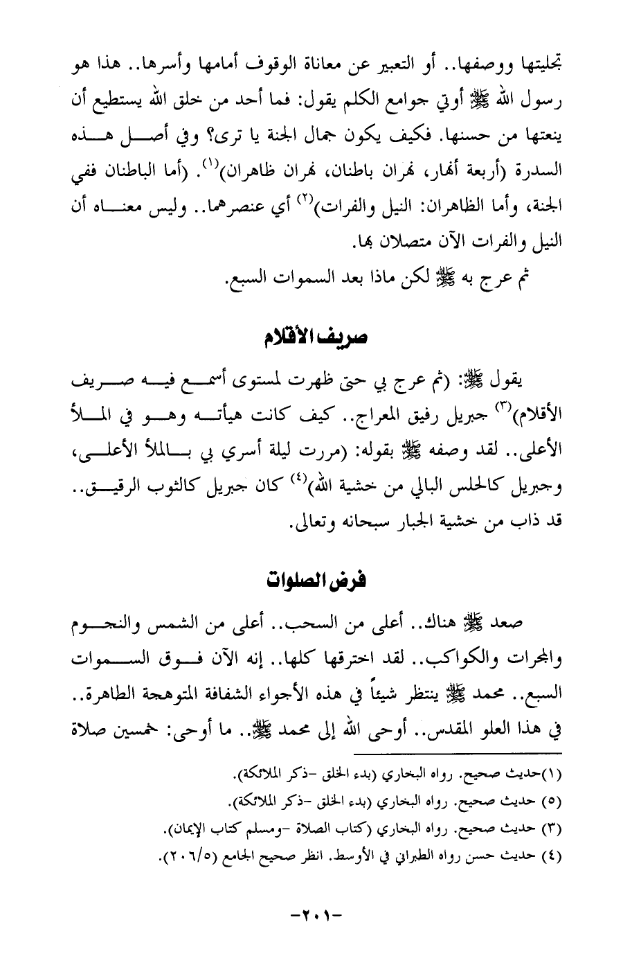 يقول - صلى الله عليه وسلم -: (ثم عرج بي حتى ظهرت لمستوى أسمع فيه صريف الأقلام) (¬3) جبريل رفيق المعراج .. كيف كانت هيأته وهو في الملأ الأعلى .. لقد وصفه - صلى الله عليه وسلم - بقوله: (مررت ليلة أسري بي بالملأ الأعلى، وجبريل كالحلس البالي من خشية الله) (¬4) كان جبريل كالثوب الرقيق .. قد ذاب من خشية الجبار سبحانه وتعالى.