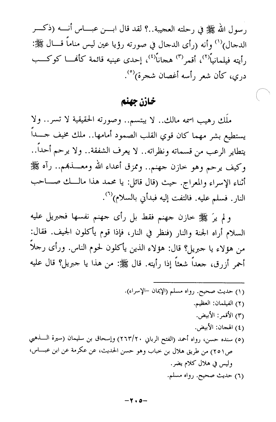 رسول الله - صلى الله عليه وسلم - في رحلته العجيبة .. ؟ لقد قال ابن عباس أنه (ذكر الدجال) (¬1) وأنه (رأى الدجال في صورته رؤيا عين ليس منامًا قال - صلى الله عليه وسلم -: رأيته فيلمانيًا (¬2)، أقمر (¬3) هجانًا (¬4)، إحدى عينيه قائمة كأنها كوكب دري، كأن شعر رأسه أغصان شَجرة) (¬5).