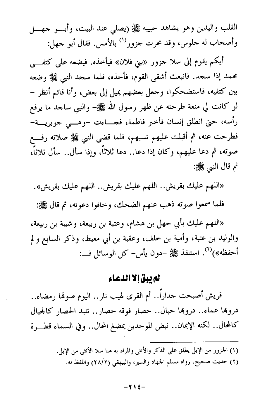 القلب واليدين وهو يشاهد حبيبه - صلى الله عليه وسلم - (يصلي عند البيت، وأبو جهل وأصحاب له جلوس، وقد نحرت جزور (¬1) بالأمس. فقال أبو جهل: