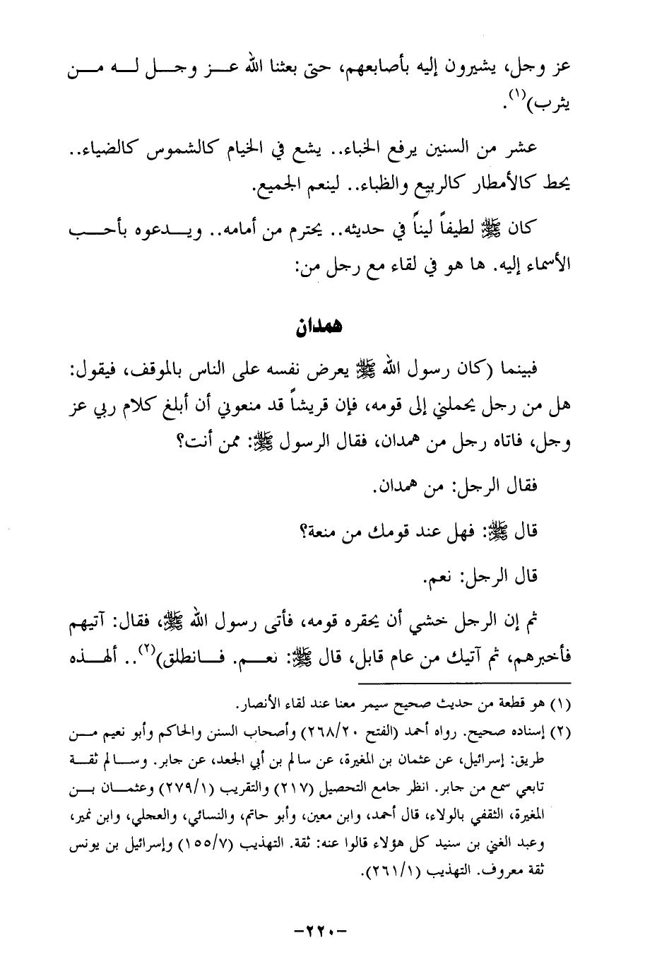 فبينما (كان رسول الله - صلى الله عليه وسلم - يعرض نفسه على الناس بالموقف، فيقول: هل من رجل يحملني إلى قومه، فإن قريشًا قد منعوني أن أبلغ كلام ربي عَزَّ وجَلَّ، فأتاه رجل من همدان، فقال الرسول - صلى الله عليه وسلم -: ممّن أنت؟