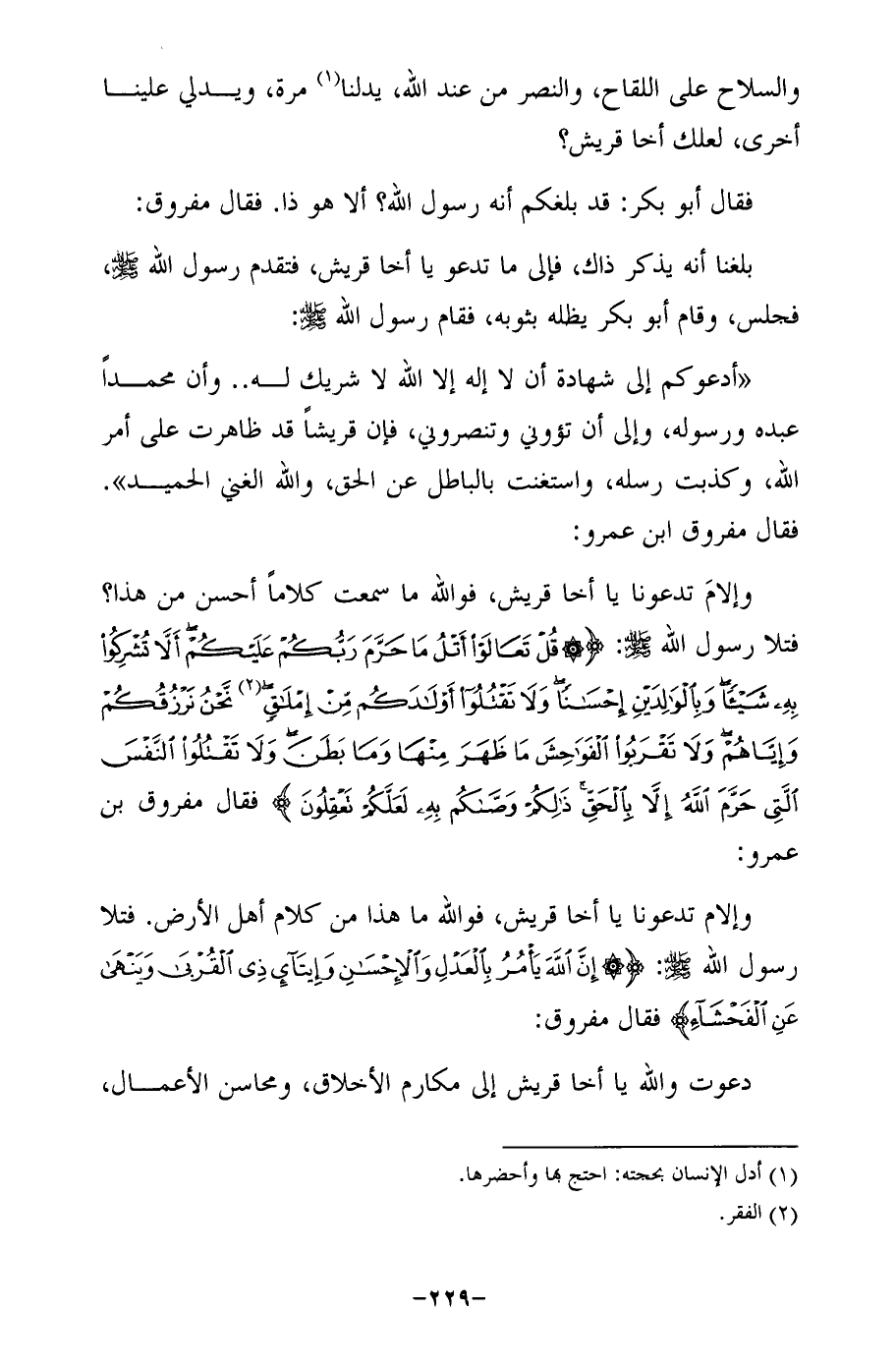 وإلامَ تدعونا يا أخا قريش، فوالله ما سمعت كلامًا أحسن من هذا؟ فتلا رسول الله - صلى الله عليه وسلم -: {قُلْ تَعَالَوْا أَتْلُ مَا حَرَّمَ رَبُّكُمْ عَلَيْكُمْ أَلَّا تُشْرِكُوا بِهِ شَيْئًا وَبِالْوَالِدَيْنِ إِحْسَانًا وَلَا تَقْتُلُوا أَوْلَادَكُمْ مِنْ إِمْلَاقٍ (¬2) نَحْنُ نَرْزُقُكُمْ وَإِيَّاهُمْ وَلَا تَقْرَبُوا الْفَوَاحِشَ مَا ظَهَرَ مِنْهَا وَمَا بَطَنَ وَلَا تَقْتُلُوا النَّفْسَ الَّتِي حَرَّمَ اللَّهُ إِلَّا بِالْحَقِّ ذَلِكُمْ وَصَّاكُمْ بِهِ لَعَلَّكُمْ تَعْقِلُونَ} فقال مفروق بن عمرو: