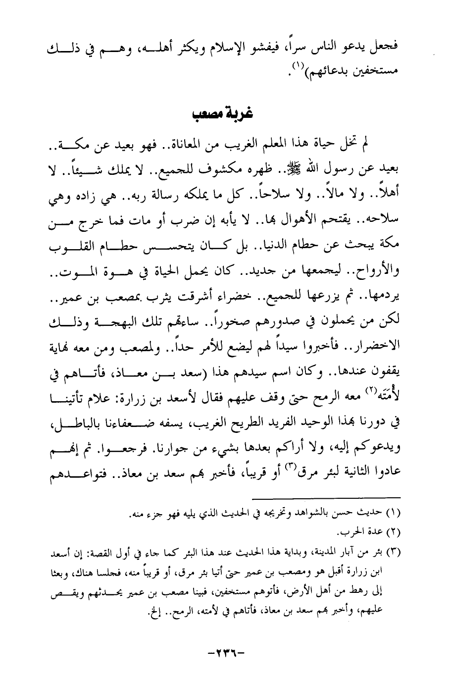 لم تخل حياة هذا المعلم الغريب من المعاناة .. فهو بعيد عن مكة .. بعيد عن رسول الله - صلى الله عليه وسلم - .. ظهره مكشوف للجميع .. لا يملك شيئًا .. لا أهلًا .. ولا مالًا .. ولا سلاحًا .. كل ما يملكه رسالة ربه .. هي زاده وهي سلاحه .. يقتحم الأهوال بها .. لا يأبه إن ضرب أو مات فما خرج من مكة يبحث عن حطام الدنيا .. بل كان يتحسس حطام القلوب والأرواح .. ليجمعها من جديد .. كان يحمل الحياة في هوة الموت .. يردمها .. ثم يزرعها للجميع .. خضراء أشرقت يثرب بمصعب بن عمير .. لكن من يحملون في صدورهم صخورًا .. ساءتهم تلك البهجة وذلك الاخضرار .. فأخبروا سيدًا لهم ليضع للأمر حدًا .. ولمصعب ومن معه نهاية يقفون عندها .. وكان اسم سيدهم هذا (سعد بن معاذ، فأتاهم في لأمَتَه (¬2) معه الرمح حتى وقف عليهم فقال لأسعد بن زرارة: علام تأتينا في دورنا بهذا الوحيد الفريد الطريح الغريب، يسفه ضعفاءنا بالباطل، ويدعوكم إليه، ولا أراكم بعدها بشيء من جوارنا. فرجعوا. ثم إنهم عادوا الثانية لبئر مرق (¬3) أو قريبًا، فأخبر بهم سعد بن معاذ .. فتواعدهم
