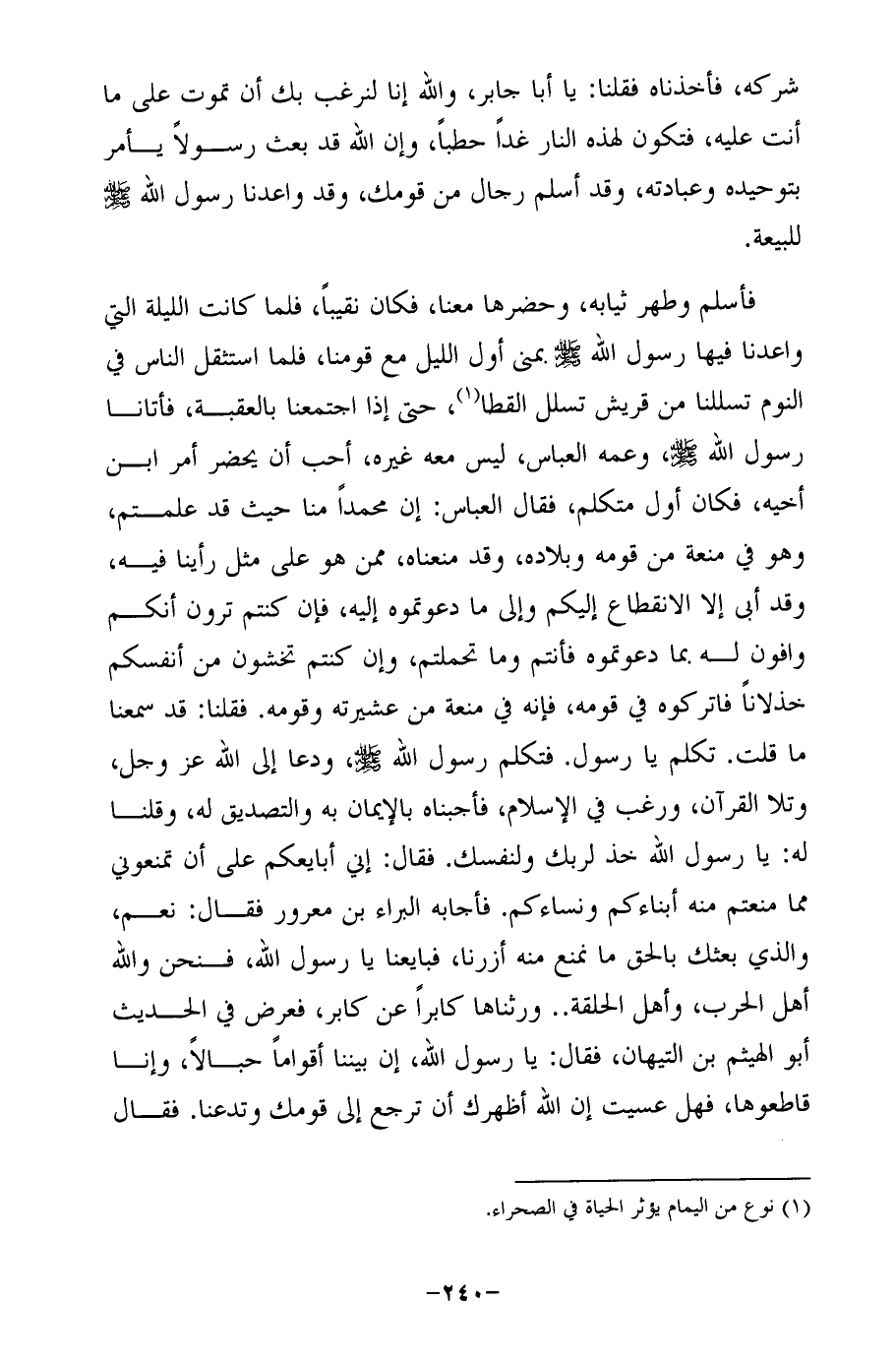 فأسلم وطهر ثيابه، وحضرها معنا، فكان نقيبًا، فلما كانت الليلة التي واعدنا فيها رسول الله -صلى الله عليه وسلم - بمنى أول الليل مع قومنا، فلما استثقل الناس في النوم تسللنا من قريش تسلل القطا (¬1)، حتى إذا اجتمعنا بالعقبة، فأتانا رسول الله - صلى الله عليه وسلم -، وعمه العباس، ليس معه غيره، أحب أن يحضر أمر ابن أخيه، فكان أول متكلم، فقال العباس: إن محمدًا منا حيث قد علمتم، وهو في منعة من قومه وبلاده، وقد منعناه، ممّن هو على مثل رأينا فيه، وقد أبى إلا الانقطاع إليكم وإلى ما دعوتموه إليه، فإن كنتم ترون أنكم وافون له بما دعوتموه فأنتم وما تحملتم، وإن كنتم تخشون من أنفسكم خذلانًا فاتركوه في قومه، فإنه في منعة من عشيرته وقومه. فقلنا: قد سمعنا ما قلت. تكلم يا رسول. فتكلم رسول الله -صلى الله عليه وسلم -، ودعا إلى الله عَزَّ وَجَلَّ، وتلا القرآن، ورغب في الإِسلام، فأجبناه بالإيمان به والتصديق له، وقلنا له: يا رسول الله خذ لربك ولنفسك. فقال: إني أبايعكم على أن تمنعوني مما منعتم منه أبناءكم ونساءكم. فأجابه البراء بن معرور فقال: نعم، والذي بعثك بالحق ما نمنع منه أزرنا، فبايعنا يا رسول الله، فنحن والله أهل الحرب، وأهل الحلقة .. ورثناها كابرًا عن كابر، فعرض في الحديث أبو الهيثم بن التيهان، فقال: يا رسول الله، إن بيننا أقوامًا حبالًا، وإنا قاطعوها، فهل عسيت إن الله أظهرك أن ترجع إلى قومك وتدعنا. فقال