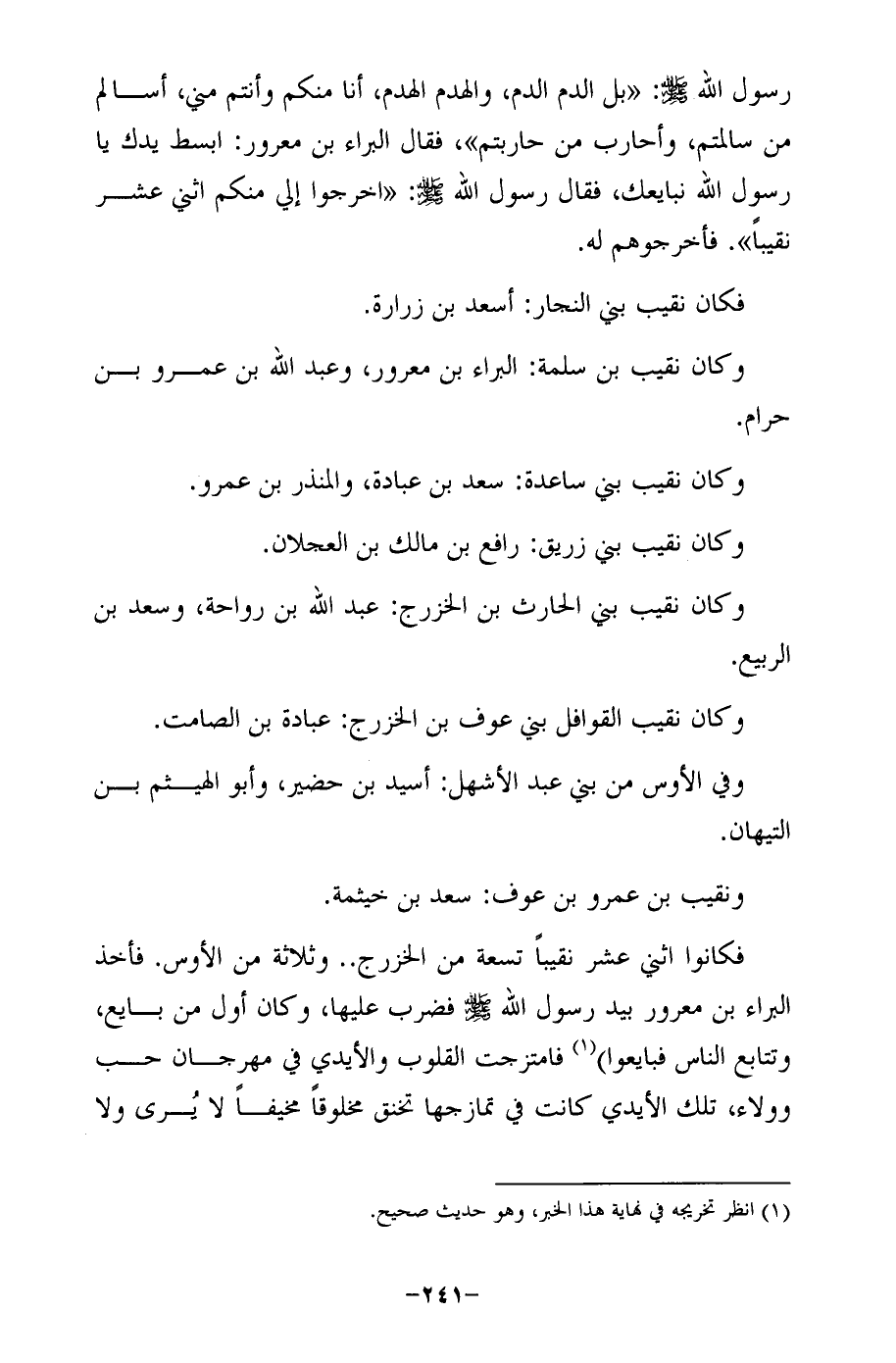 رسول الله - صلى الله عليه وسلم -: "بل الدم الدم، والهدم الهدم، أنا منكم وأنتم مني، أسالم من سالمتم، وأحارب من حاربتم"، فقال البراء بن معرور: ابسط يدك يا رسول الله نبايعك، فقال رسول الله - صلى الله عليه وسلم -: "اخرجوا إلي منكم اثني عشر نقيبًا". فأخرجوهم له.