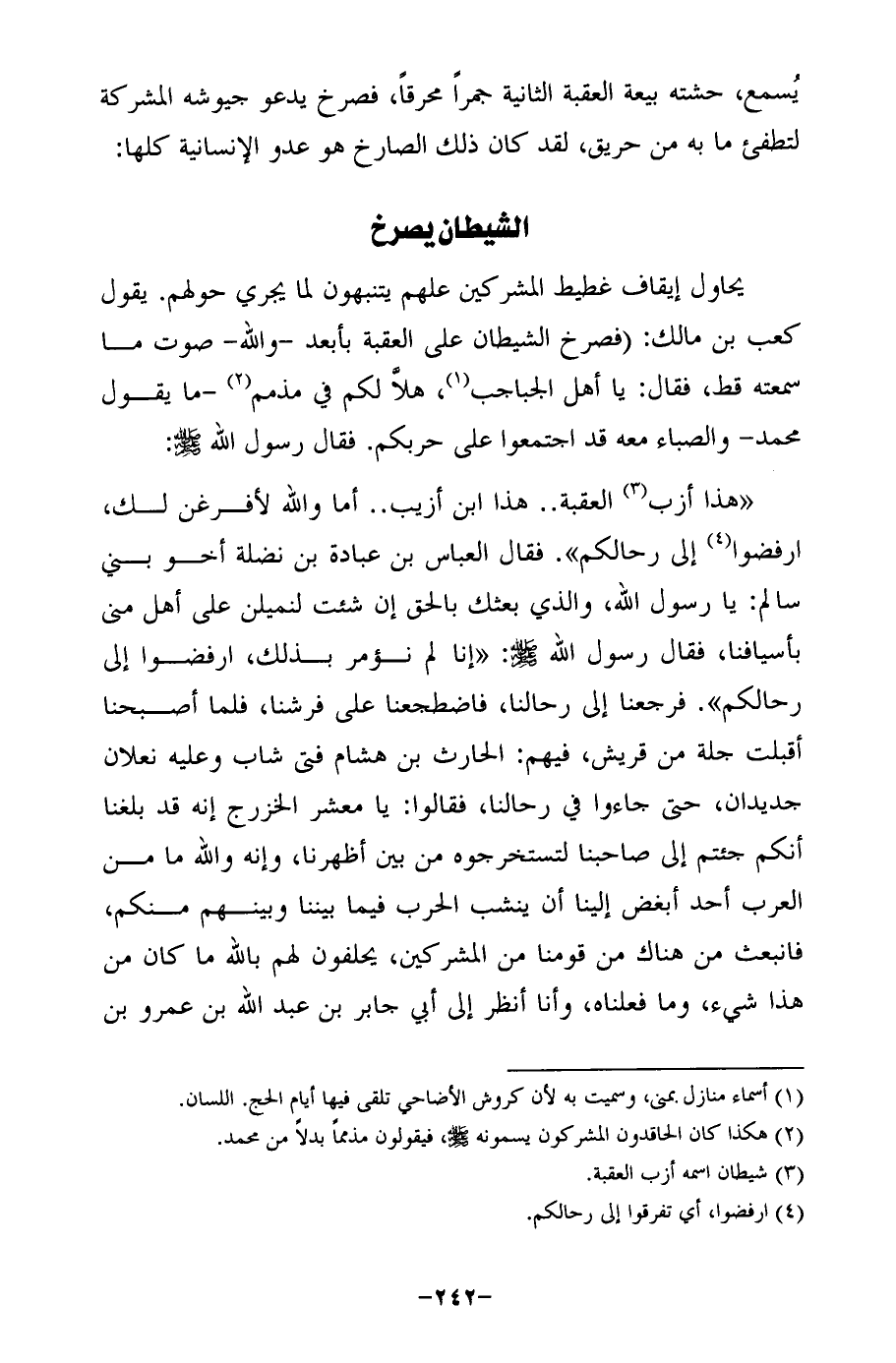 يحاول إيقاف غطيط المشركين علهم يتنبهون لما يجري حولهم. يقول كعب بن مالك: (فصرخ الشيطان على العقبة بأبعد -والله- صوت ما سمعته قط، فقال: يا أهل الجباجب (¬1)، هلَّا لكم في مذمم (¬2) -ما يقول محمَّد- والصباء معه قد اجتمعوا على حربكم. فقال رسول الله - صلى الله عليه وسلم -:
