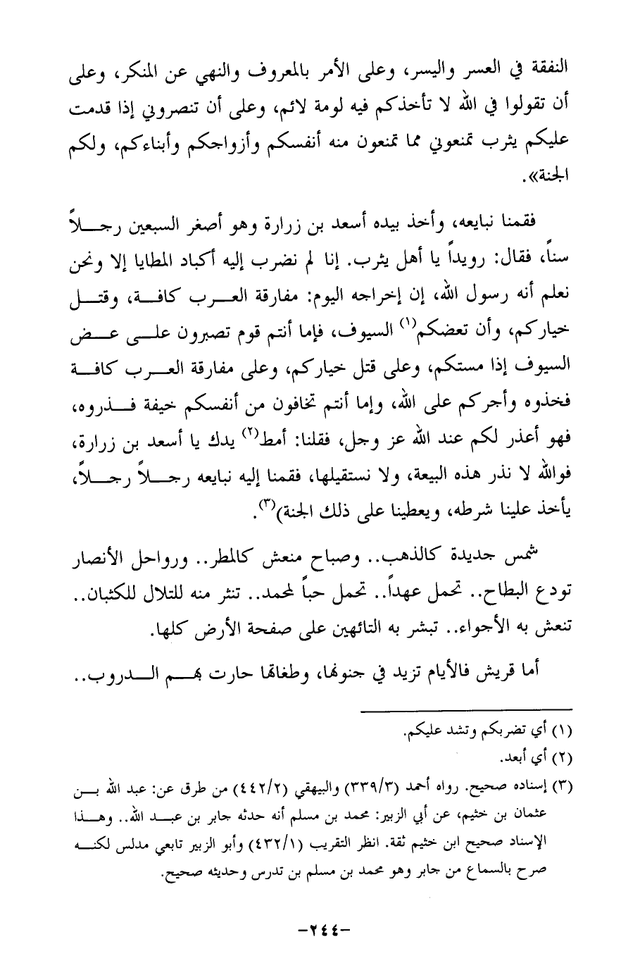 فقمنا نبايعه، وأخذ بيده أسعد بن زرارة وهو أصغر السبعن رجلًا سنًا، فقال: رويدًا يا أهل يثرب. إنا لم نضرب إليه أكباد المطايا إلا ونحن نعلم أنه رسول الله، إن إخراجه اليوم: مفارقة العرب كافة، وقتل خياركم، وأن تعضكم (¬1) السيوف، فإما أنتم قوم تصبرون على عض السيوف إذا مستكم، وعلى قتل خياركم، وعلى مفارقة العرب كافة فخذوه وأجركم على الله، وإما أنتم تخافون من أنفسكم خيفة فذروه، فهو أعذر لكم عند الله عَزَّ وَجَلَّ، فقلنا: أمط (¬2) يدك يا أسعد بن زرارة، فوالله لا نذر هذه البيعة، ولا نستقيلها، فقمنا إليه نبايعه رجلًا رجلًا، يأخذ علينا شرطه، ويعطينا على ذلك الجنة) (¬3).