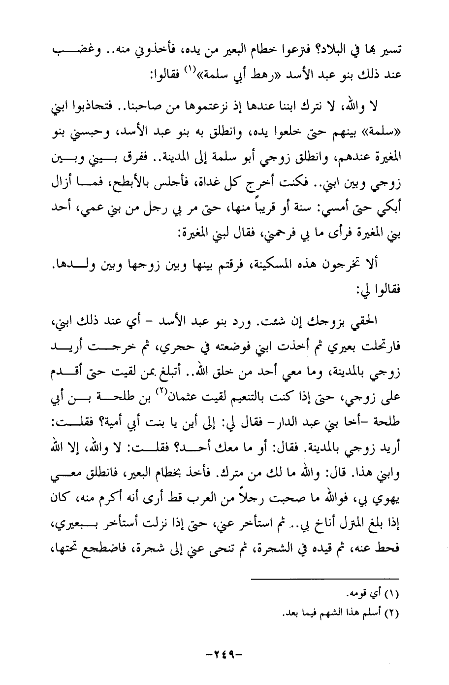 إلحقى بزوجك إن شئت. ورد بنو عبد الأسد -أي عند ذلك ابني، فارتحلت بعيري ثم أخذت ابني فوضعته في حجري، ثم خرجت أريد زوجي بالمدينة، وما معي أحد من خلق الله .. أتبلغ بمن لقيت حتى أقدم على زوجي، حتى إذا كنت بالتنعيم لقيت عثمان (¬2) بن طلحة بن أبي طلحة -أخا بني عبد الدار- فقال لي: إلى أين يا بنت أبي أمية؟ فقلت: أريد زوجي بالمدينة. فقال: أوما معك أحد؟ فقلت: لا والله، إلا الله وابني هذا. قال: والله ما لك من مترك. فأخذ بخطام البعير، فانطلق معي يهوي بي، فوالله ما صحبت رجلًا من العرب قط أرى أنه أكرم منه، كان إذا بلغ المنزل أناخ بي .. ثم استأخر عني، حتى إذا نزلت أستأخر ببعيري، فحط عنه، ثم قيده في الشجرة، ثم تنحى عني إلى شجرة، فاضطجع تحتها،
