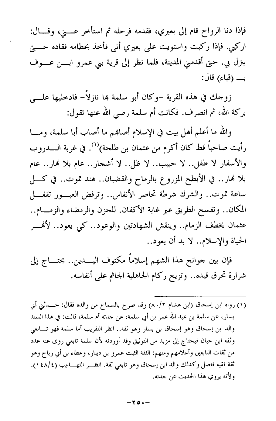 (¬1) رواه ابن إسحاق (ابن هشام 2/ 80) وقد صرح بالسماع من والده فقال: حدثني أبي يسار، عن سلمة بن عبد الله عمر بن أبي سلمة، عن جدته أم سلمة، قالت: في هذا السند والد ابن إسحاق وهو إسحاق بن يسار وهو ثقة .. انظر التقريب أما سلمة فهو تابعى وثقه ابن حبان فيحتاج إلى مزيد من التوثيق وقد أوردته لأن سلمة تابعى روى عنه عدد من ثقات التابعين وأعلامهم ومنهم: الثقة الثبت عمرو بن دينار، وعطاء بن أبي رباح وهو ثقة فقيه فاضل وكذلك والد ابن إسحاق وهو تابعى ثقة. انظر التهذيب (4/ 148). ولأنه يروي هذا الحديث عن جدته.