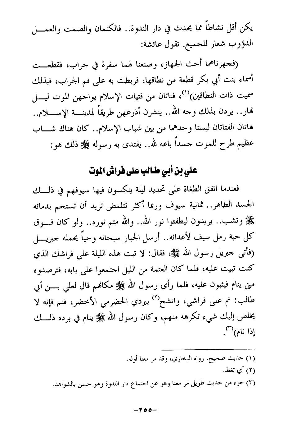 (فجهزناهما أحث الجهاز، وصنعنا لهما سفرة في جراب، فقطعت أسماء بنت أبي بكر قطعة من نطاقها، فربطت به على فم الجراب، فبذلك سميت ذات النطاقين) (¬1)، فتاتان من فتيات الإسلام يواجهن الموت ليل نهار .. يردن بذلك وجه الله .. ينشرن أذرعهن طريقًا لمدينة الإسلام .. هاتان الفتاتان ليستا وحدهما من بين شباب الإسلام .. كان هناك شاب عظيم طرح للموت جسدًا باعه لله .. يفتدى به رسوله - صلى الله عليه وسلم- ذلك هو: