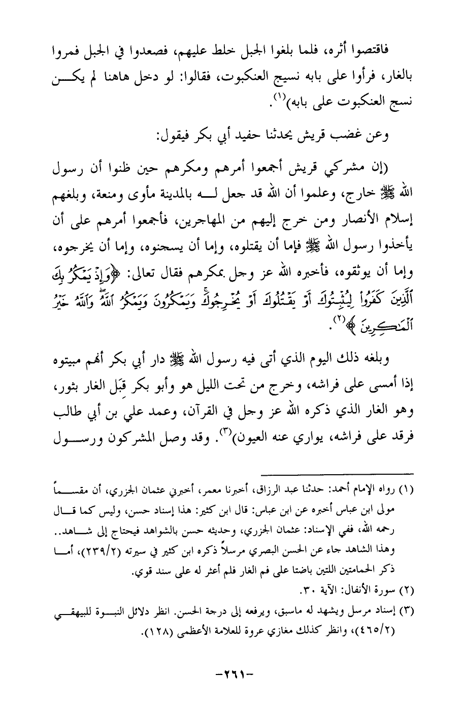 (¬1) رواه الإمام أحمد: حدثنا عبد الرزاق، أخبرنا معمر، أخبرني عثمان الجزري، أن مقسمًا مولى ابن عباس أخبره عن ابن عباس: قال ابن كثير: هذا إسناد حسن، وليس كما قال رحمه الله، ففي الإسناد: عثمان الجزري، وحديثه حسن بالشواهد فيحتاج إلى شاهد .. وهذا الشاهد جاء عن الحسن البصري مرسلًا ذكره ابن كثير في سيرته (2/ 239)، أما ذكر الحمامتين اللتين باضتا على فم الغار فلم أعثر له على سند قوي.