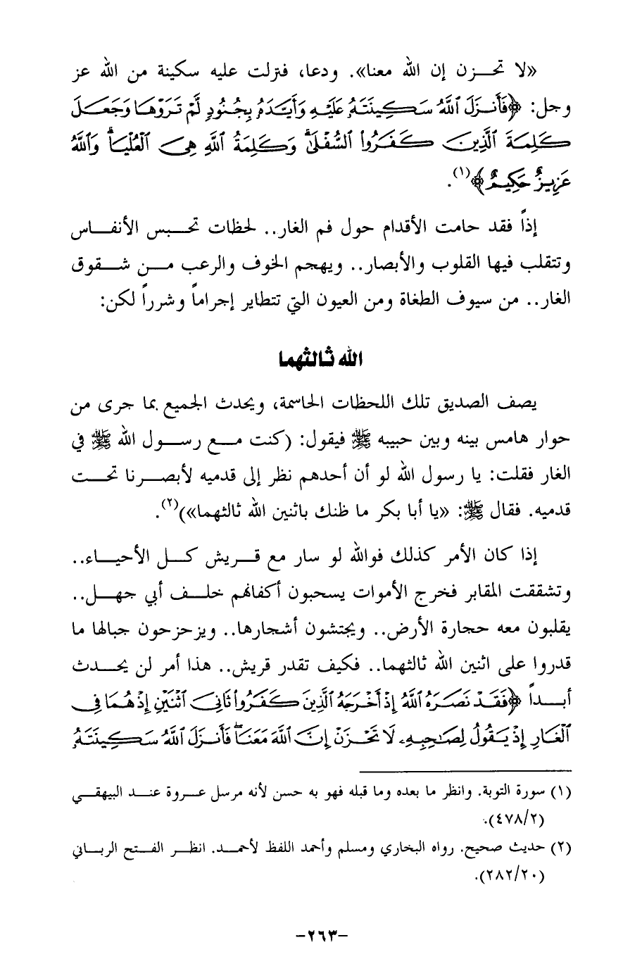 إذا كان الأمركذلك فوالله لو سار مع قريش كل الأحياء .. وتشققت المقابر فخرج الأموات يسحبون أكفانهم خلف أبي جهل .. يقلبون معه حجارة الأرض .. ويجتشون أشجارها .. ويزحزحون جبالها ما قدروا على اثنين الله ثالثهما .. فكيف تقدر قريش .. هذا أمر لن يحدث أبدًا {فَقَدْ نَصَرَهُ اللَّهُ إِذْ أَخْرَجَهُ الَّذِينَ كَفَرُوا ثَانِيَ اثْنَيْنِ إِذْ هُمَا فِي الْغَارِ إِذْ يَقُولُ لِصَاحِبِهِ لَا تَحْزَنْ إِنَّ اللَّهَ مَعَنَا فَأَنْزَلَ اللَّهُ سَكِينَتَهُ