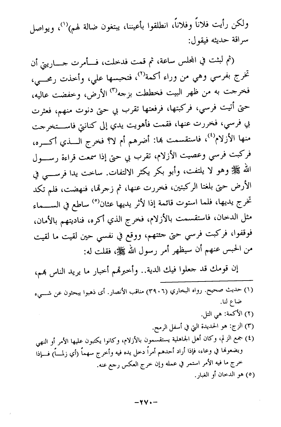 (ثم لبثت في المجلس ساعة، ثم قمت فدخلت، فأمرت جاريتي أن تخرج بفرسي وهي من وراء أكمة (¬2)، فتحبسها علي، وأخذت رمحي، فخرجت به من ظهر البيت فخططت بزجه (¬3) الأرض، وخفضت عاليه، حتى أتيت فرسي، فركبتها، فرفعتها تقرب بي حتى دنوت منهم، فعثرت بي فرسي، فخررت عنها، فقمت فأهويت يدي إلى كنانتي فاستخرجت منها الأزلام (¬4)، فاستقسمت بها: أضرهم أم لا؟ فخرج الذي أكره، فركبت فرسي وعصيت الأزلام، تقرب بي حتى إذا سمعت قراءة رسول الله - صلى الله عليه وسلم - وهو لا يلتفت، وأبو بكر يكثر الالتفات. ساخت يدا فرسي في الأرض حتى بلغتا الركبتين، فخررت عنها، ثم زجرتها، فنهضت، فلم تكد تخرج يديها، فلما استوت قائمة إذا لأثر يديها عثان (¬5) ساطع في السماء مثل الدخان، فاستقسمت بالأزلام، فخرج الذي أكره، فناديتهم بالأمان، فوقفوا، فركبت فرسي حتى جئتهم، ووقع في نفسي حين لقيت ما لقيت من الحبس عنهم أن سيظهر أمر رسول الله -صلى الله عليه وسلم-، فقلت له: