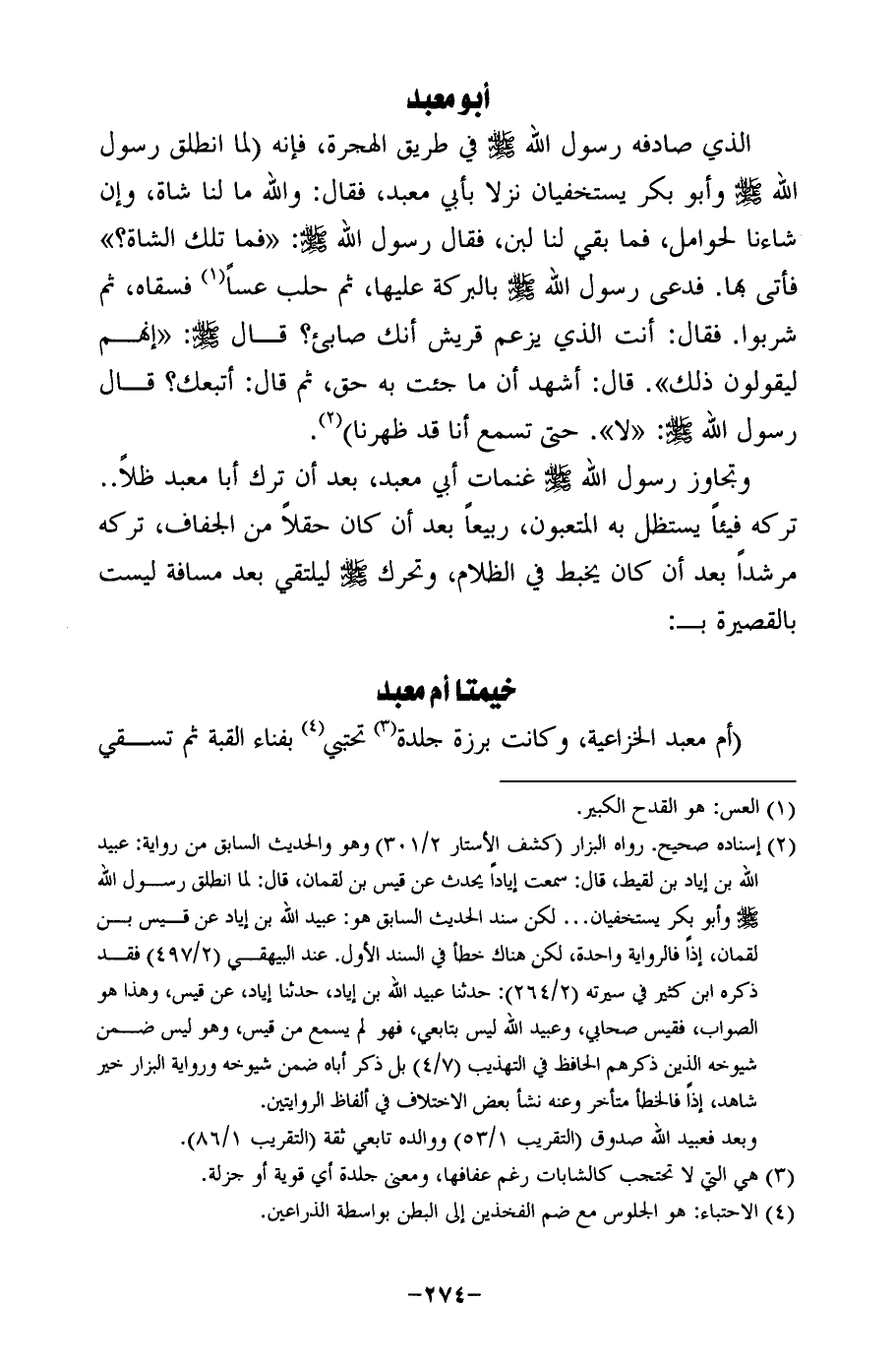 الذي صادفه رسول الله -صلى الله عليه وسلم- في طريق الهجرة، فإنه (لما انطلق رسول الله - صلى الله عليه وسلم - وأبو بكر يستخفيان نزلا بأبي معبد، فقال: والله ما لنا شاة، وإن شاءنا لحوامل، فما بقي لنا لبن، فقال رسول الله -صلى الله عليه وسلم-:"فما تلك الشاة؟ " فأتى بها. فدعى رسول الله -صلى الله عليه وسلم- بالبركة عليها، ثم حلب عسًا (¬1) فسقاه، ثم شربوا. فقال: أنت الذي يزعم قريش أنك صابئ؟ قال - صلى الله عليه وسلم -:"إنهم ليقولون ذلك". قال: أشهد أن ما جئت به حق، ثم قال: أتبعك؟ قال رسول الله -صلى الله عليه وسلم-: "لا". حتى تسمع أنا قد ظهرنا) (¬2).
