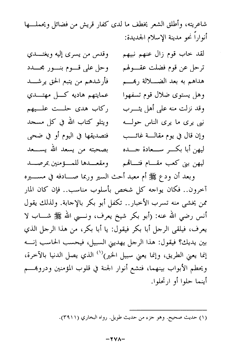 وبعد أن ودع - صلى الله عليه وسلم - أم معبد أحث السير وربما صادفه في مسيره آخرون .. فكان يواجه كل شخص بأسلوب مناسب .. فإن كان المار ممّن يخشى منه تسرب الأخبار .. تكفل أبو بكر بالإجابة. ولذلك يقول أنس رضي الله عنه: (أبو بكر شيخ يعرف، ونبي الله - صلى الله عليه وسلم - شاب لا يعرف، فيلقى الرجل أبا بكر فيقول: يا أبا بكر، من هذا الرجل الذي بين يديك؟ فيقول: هذا الرجل يهديني السبيل، فيحسب الحاسب إنه إنما يعني الطريق، وإنما يعني سبيل الخير) (¬1) الذي يصل الدنيا بالآخرة، ويحطم الأبواب بينهما، فتشع أنوار الجنة في قلوب المؤمنين ودروبهم أينما حلوا أو ارتحلوا.