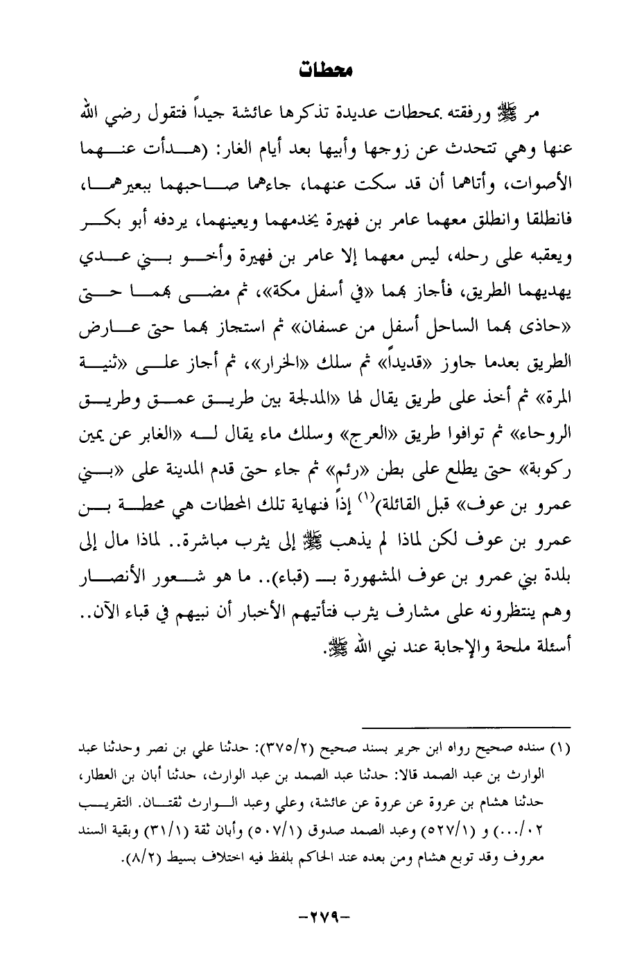 مر- صلى الله عليه وسلم - ورفقته بمحطات عديدة تذكرها عائشة جيدًا فتقول رضي الله عنها وهي تتحدث عن زوجها وأبيها بعد أيام الغار: (هدأت عنهما الأصوات، وأتاهما أن قد سكت عنهما، جاءهما صاحبهما ببعيرهما، فانطلقا وانطلق معهما عامر بن فهيرة يخدمهما ويعينهما، يردفه أبو بكر ويعقبه على رحله، ليس معهما إلا عامر بن فهيرة وأخو بني عدي يهديهما الطريق، فأجاز بهما "في أسفل مكة"، ثم مضى بهما حتى "حاذى بهما الساحل أسفل من عسفان" ثم استجاز بهما حتى عارض الطريق بعدما جاوز "قديدًا" ثم سلك "الخرار"، ثم أجاز على "ثنية المرة" ثم أخذ على طريق يقال لها "المدلجة بين طريق عمق وطريق الروحاء" ثم توافوا طريق "العرج" وسلك ماء يقال له "الغابر عن يمين ركوبة" حتى يطلع على بطن "رئم" ثم جاء حتى قدم المدينة على "بني عمرو بن عوف" قبل القائلة) (¬1) إذًا فنهاية تلك المحطات هي محطة بن عمرو بن عوف لكن لماذا لم يذهب - صلى الله عليه وسلم - إلى يثرب مباشرة .. لماذا مال إلى بلدة بني عمرو بن عوف المشهورة بـ (قباء) .. ما هو شعور الأنصار وهم ينتظرونه على مشارف يثرب فتأتيهم الأخبار أن نبيهم في قباء الآن .. أسئلة ملحة والإجابة عند نبي الله - صلى الله عليه وسلم -.