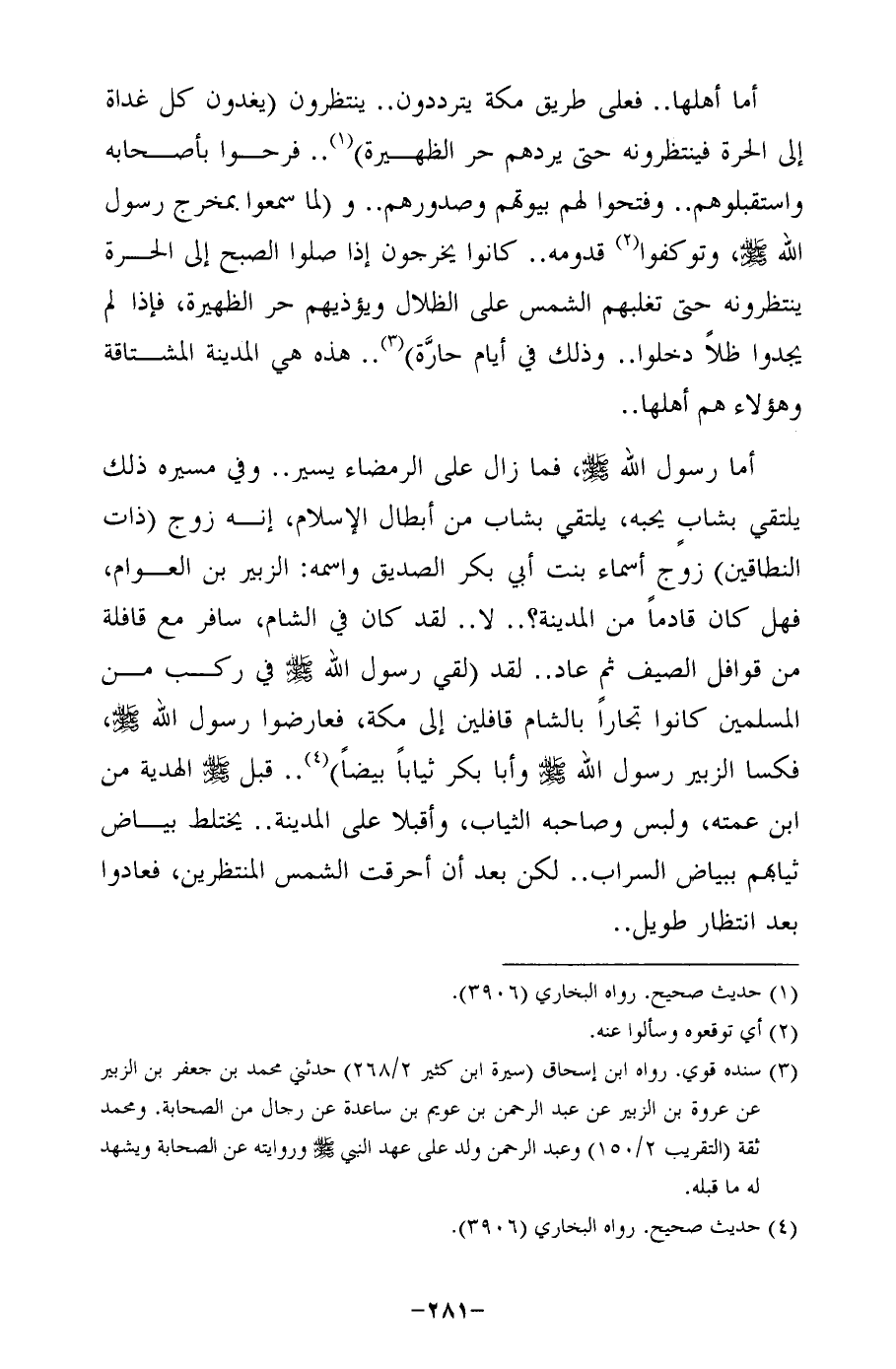 أما رسول الله -صلى الله عليه وسلم-، فما زال على الرمضاء يسير .. وفي مسيره ذلك يلتقي بشابٍ يحبه، يلتقي بشاب من أبطال الإسلام، إنه زوج (ذات النطاقين) زوج أسماء بنت أبي بكر الصديق واسمه: الزبير بن العوام، فهل كان قادمًا من المدينة؟ .. لا .. لقد كان في الشام، سافر مع قافلة من قوافل الصيف ثم عاد .. لقد (لقي رسول الله -صلى الله عليه وسلم- في ركب من المسلمين كانوا تجارًا بالشام قافلين إلى مكة، فعارضوا رسول الله -صلى الله عليه وسلم-، فكسا الزبير رسول الله -صلى الله عليه وسلم- وأبا بكر ثيابًا بيضًا) (¬4) .. قبل- صلى الله عليه وسلم - الهدية من ابن عمته، ولبس وصاحبه الثياب، وأقبلا على المدينة .. يختلط بياض ثيابهم ببياض السراب .. لكن بعد أن أحرقت الشمس المنتظرين، فعادوا بعد انتظار طويل ..