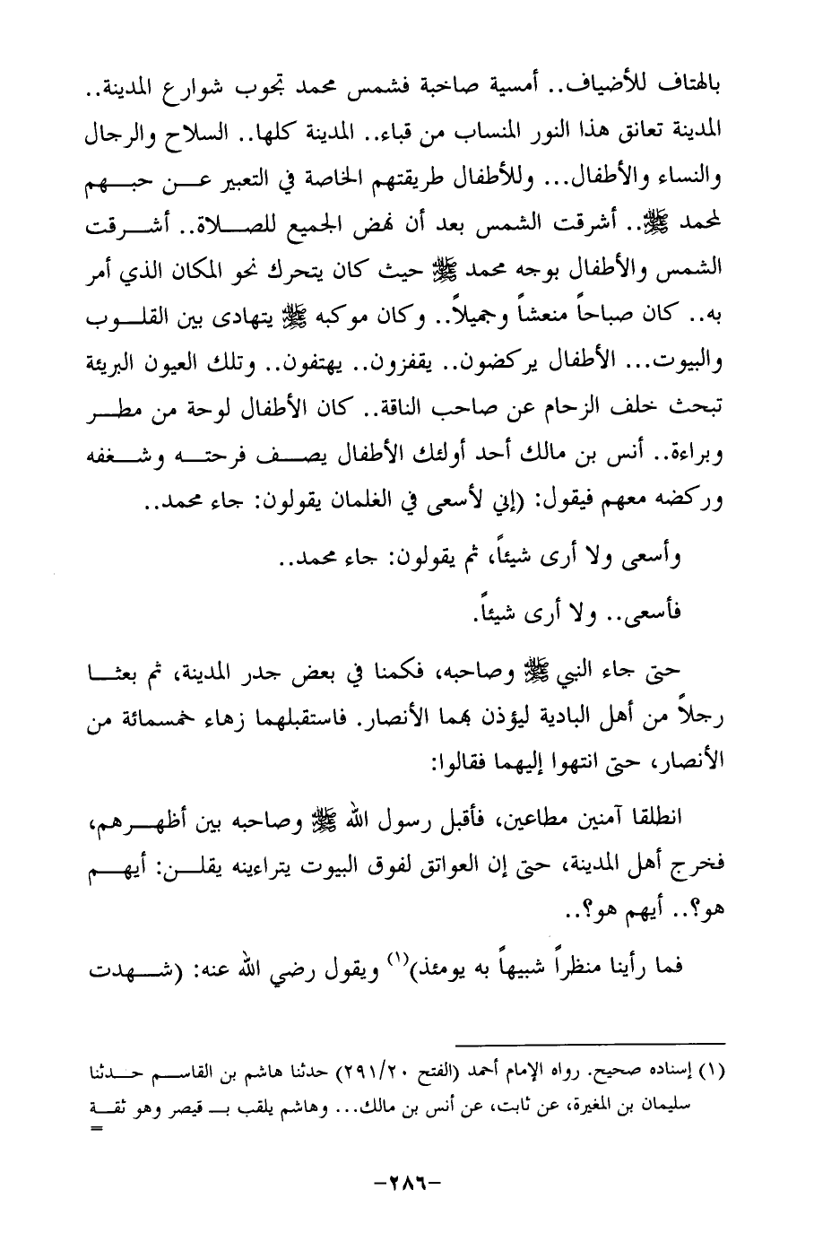 بالهتاف للأضياف .. أمسية صاخبة فشمس محمد تجوب شوارع المدينة .. المدينة تعانق هذا النور المنساب من قباء .. المدينة كلها .. السلاح والرجال والنساء والأطفال ... وللأطفال طريقتهم الخاصة في التعبير عن حبهم لمحمد - صلى الله عليه وسلم - .. أشرقت الشمس بعد أن نهض الجميع للصلاة .. أشرقت الشمس والأطفال بوجه محمد - صلى الله عليه وسلم - حيث كان يتحرك نحو المكان الذي أمر به .. كان صباحًا منعشًا وجميلًا .. وكان موكبه - صلى الله عليه وسلم - يتهادى بين القلوب والبيوت ... الأطفال يركضون .. يقفزون .. يهتفون .. وتلك العيون البريئة تبحث خلف الزحام عن صاحب الناقة .. كان الأطفال لوحة من مطر وبراءة .. أنس بن مالك أحد أولئك الأطفال يصف فرحته وشغفه وركضه معهم فيقول: (إني لأسعى في الغلمان يقولون: جاء محمد ..