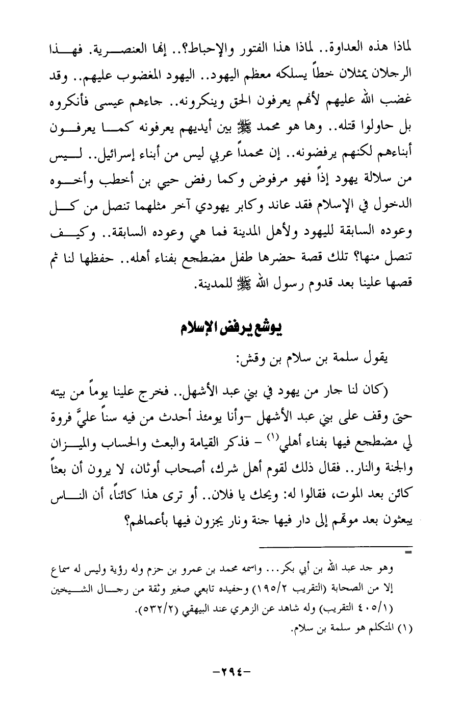 لماذا هذه العداوة .. لماذا هذا الفتور والإحباط؟ .. إنها العنصرية. فهذا الرجلان يمثلان خطًا يسلكه معظم اليهود .. اليهود المغضوب عليهم .. وقد غضب الله عليهم لأنهم يعرفون الحق وينكرونه .. جاءهم عيسى فأنكروه بل حاولوا قتله .. وها هو محمد - صلى الله عليه وسلم -بين أيديهم يعرفونه كما يعرفون أبناءهم لكنهم يرفضونه .. إن محمدًا عربي ليس من أبناء إسرائيل .. ليس من سلالة يهود إذًا فهو مرفوض وكما رفض حيي بن أخطب وأخوه الدخول في الإسلام فقد عاند وكابر يهودي آخر مثلهما تنصل من كل وعوده السابقة لليهود ولأهل المدينة فما هي وعوده السابقة .. وكيف تنصل منها؟ تلك قصة حضرها طفل مضطجع بفناء أهله .. حفظها لنا ثم قصها علينا بعد قدوم رسول الله -صلى الله عليه وسلم- للمدينة.