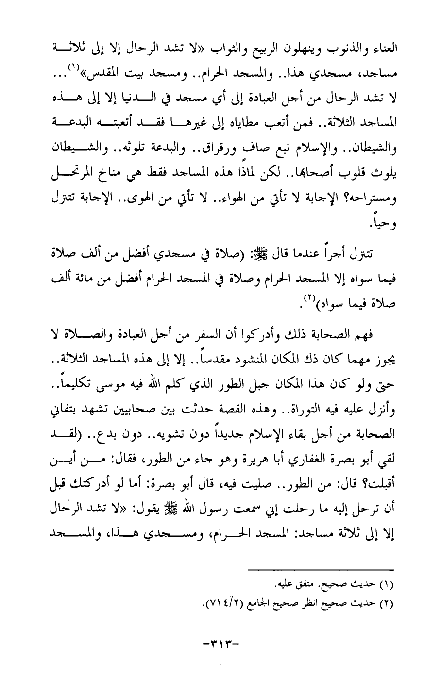 العناء والذنوب وينهلون الربيع والثواب "لا تشد الرحال إلا إلى ثلاثة مساجد، مسجدي هذا .. والمسجد الحرام .. ومسجد بيت المقدس" (¬1) ... لا تشد الرحال من أجل العبادة إلى أي مسجد في الدنيا إلا إلى هذه المساجد الثلاثة .. فمن أتعب مطاياه إلى غيرها فقد أتعبته البدعة والشيطان .. والإِسلام نبع صافٍ ورقراق .. والبدعة تلوثه .. والشيطان يلوث قلوب أصحابها .. لكن لماذا هذه المساجد فقط هي مناخ المرتحل ومستراحه؟ الإجابة لا تأتي من الهواء .. لا تأتي من الهوى .. الإجابة تتنزل وحيًا.