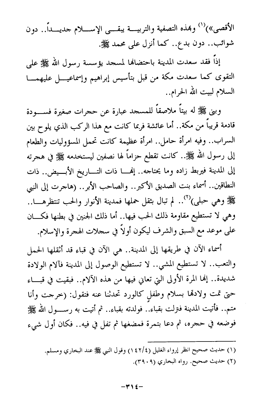وبنى -صلى الله عليه وسلم - له بيتًا ملاصقًا للمسجد عبارة عن حجرات صغيرة فسودة قادمة قريبًا من مكة .. أما عائشة فربما كانت مع هذا الركب الذي يلوح بين السراب .. وفيه امرأة حامل .. امرأة عظيمة كانت تحمل المسؤوليات والطعام إلى رسول الله -صلى الله عليه وسلم - .. كانت تقطع حزامًا لها نصفين ليستخدمه -صلى الله عليه وسلم - في هجرته إلى المدينة فيربط زاده وما يحتاجه .. إنها ذات التاريخ الأبيض .. ذات النطاقين .. أسماء بنت الصديق الأكبر .. والصاحب الأبر .. (هاجرت إلى النبي -صلى الله عليه وسلم - وهي حبلى) (¬2) .. لم تبال بثقل حملها فمدينة الأنوار والحب تنتظرها .. وهي لا تستطيع مقاومة ذلك الحب فيها .. أما ذلك الجنين في بطنها فكان على موعد مع السبق والشرف ليكون أولًا في سجلات الهجرة والإِسلام.