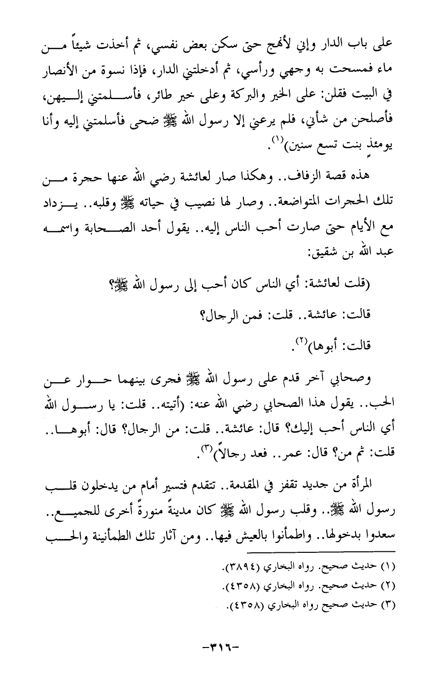 هذه قصة الزفاف .. وهكذا صار لعائشة رضي الله عنها حجرة من تلك الحجرات المتواضعة .. وصار لها نصيب في حياته -صلى الله عليه وسلم - وقلبه .. يزداد مع الأيام حتى صارت أحب الناس إليه .. يقول أحد الصحابة واسمه عبد الله بن شقيق: