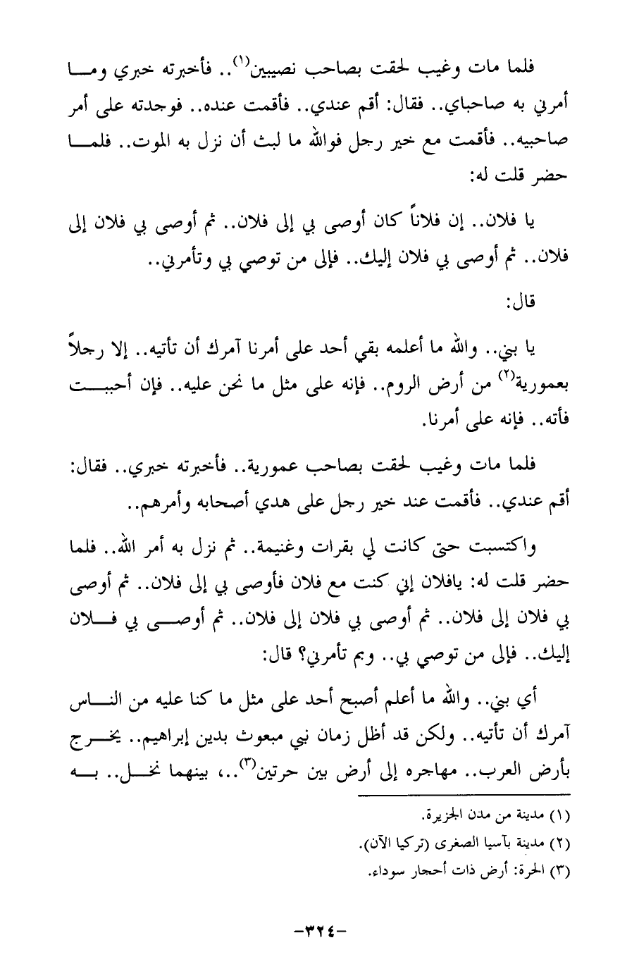 يا بني .. والله ما أعلمه بقي أحد على أمرنا آمرك أن تأتيه .. إلا رجلًا بعمورية (¬2) من أرض الروم .. فإنه على مثل ما نحن عليه .. فإن أحببت فأته .. فإنه على أمرنا.