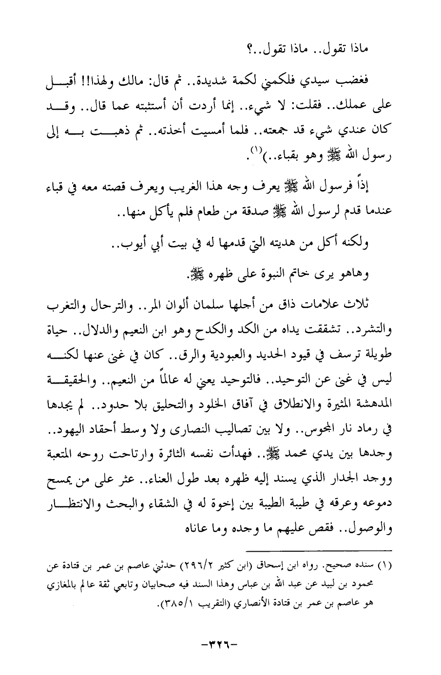 إذًا فرسول الله -صلى الله عليه وسلم - يعرف وجه هذا الغريب ويعرف قصته معه في قباء عندما قدم لرسول الله -صلى الله عليه وسلم - صدقة من طعام فلم يأكل منها ..