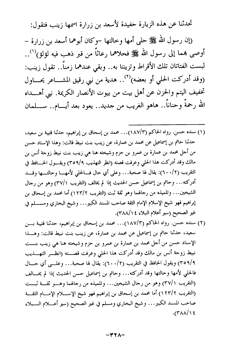 (¬2) سنده حسن. رواه الحاكم (3/ 187) ... محمَّد بن إسحاق بن إبراهيم، حدثنا قتيبة بن سعيد، حدثنا حاتم بن إسماعيل عن محمَّد بن عمارة, عن زينب بنت نبيط قالت: وهذا لإسناد حسن من أجل محمَّد بن عمارة بن عمرو بن حزم وشيخته هنا هي زينب بنت نبيط زوجة أنس بن مالك وقد أدركت هذا الحلي وعرفت قصته (انظر التهذيب 9/ 359) ويقول الحافظ في التقريب (2/ 600): يقال لها صحبة ... وعلى أي حال فالحلي لأمها وخالتها وقد أدركته ... وحاتم بن إسماعيل حسن الحديث إذا لم يخالف (التقريب 1/ 37) وهو من رجال الشيخين ... وتلميذه من رجالهما وهو ثقة ثبت (التقريب 2/ 123) أما محمَّد بن إسحاق بن إبراهيم فهو شيخ الإِسلام الإِمام الثقة صاحب المسند الكبير ... وشيخ البخاري ومسلمٌ في غير الصحيح (سير أعلام النبلاء 14/ 388).