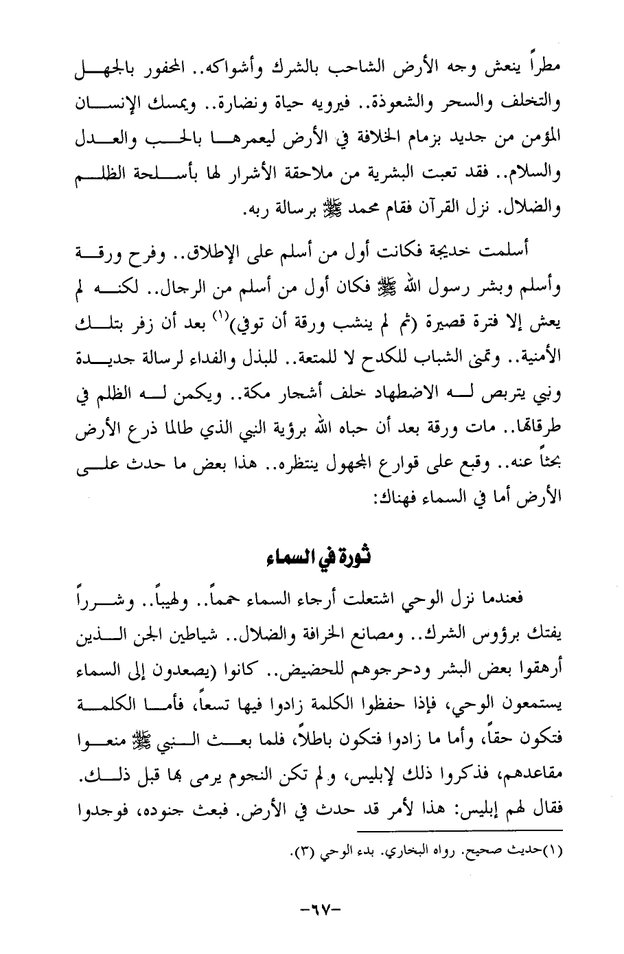 مطرًا ينعش وجه الأرض الشاحب بالشرك وأشواكه .. المحفور بالجهل والتخلف والسحر والشعوذة .. فيرويه حياة ونضارة .. ويمسك الإنسان المؤمن من جديد بزمام الخلافة في الأرض ليعمرها بالحب والعدل والسلام .. فقد تعبت البشرية من ملاحقة الأشرار لها بأسلحة الظلم والضلال. نزل القرآن فقام محمد -صلى الله عليه وسلم- برسالة ربه.