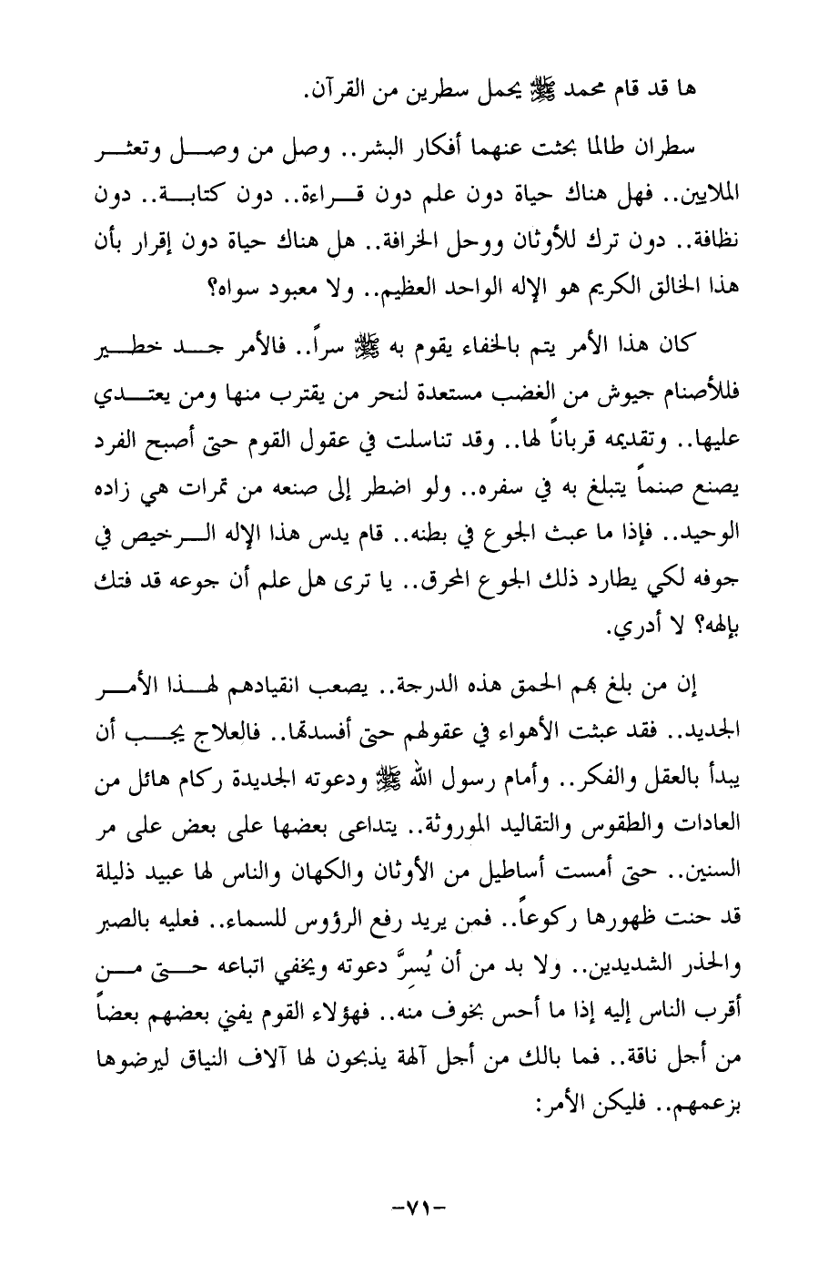 إن من بلغ بهم الحمق هذه الدرجة .. يصعب انقيادهم لهذا الأمر الجديد .. فقد عبثت الأهواء في عقولهم حتى أفسدتها .. فالعلاج يجب أن يبدأ بالعقل والفكر .. وأمام رسول الله -صلى الله عليه وسلم- ودعوته الجديدة ركام هائل من العادات والطقوس والتقاليد الموروثة .. يتداعى بعضها على بعض على مر السنين .. حتى أمست أساطيل من الأوثان والكهان والناس لها عبيد ذليلة قد حنت ظهورها ركوعًا .. فمن يريد رفع الرؤوس للسماء .. فعليه بالصبر والحذر الشديدين .. ولا بد من أن يُسِرَّ دعوته ويخفي اتباعه حتى من أقرب الناس إليه إذا ما أحس بخوف منه .. فهؤلاء القوم يفني بعضهم بعضًا من أجل ناقة .. فما بالك من أجل آلهة يذبحون لها آلاف النياق ليرضوها بزعمهم .. فليكن الأمر: