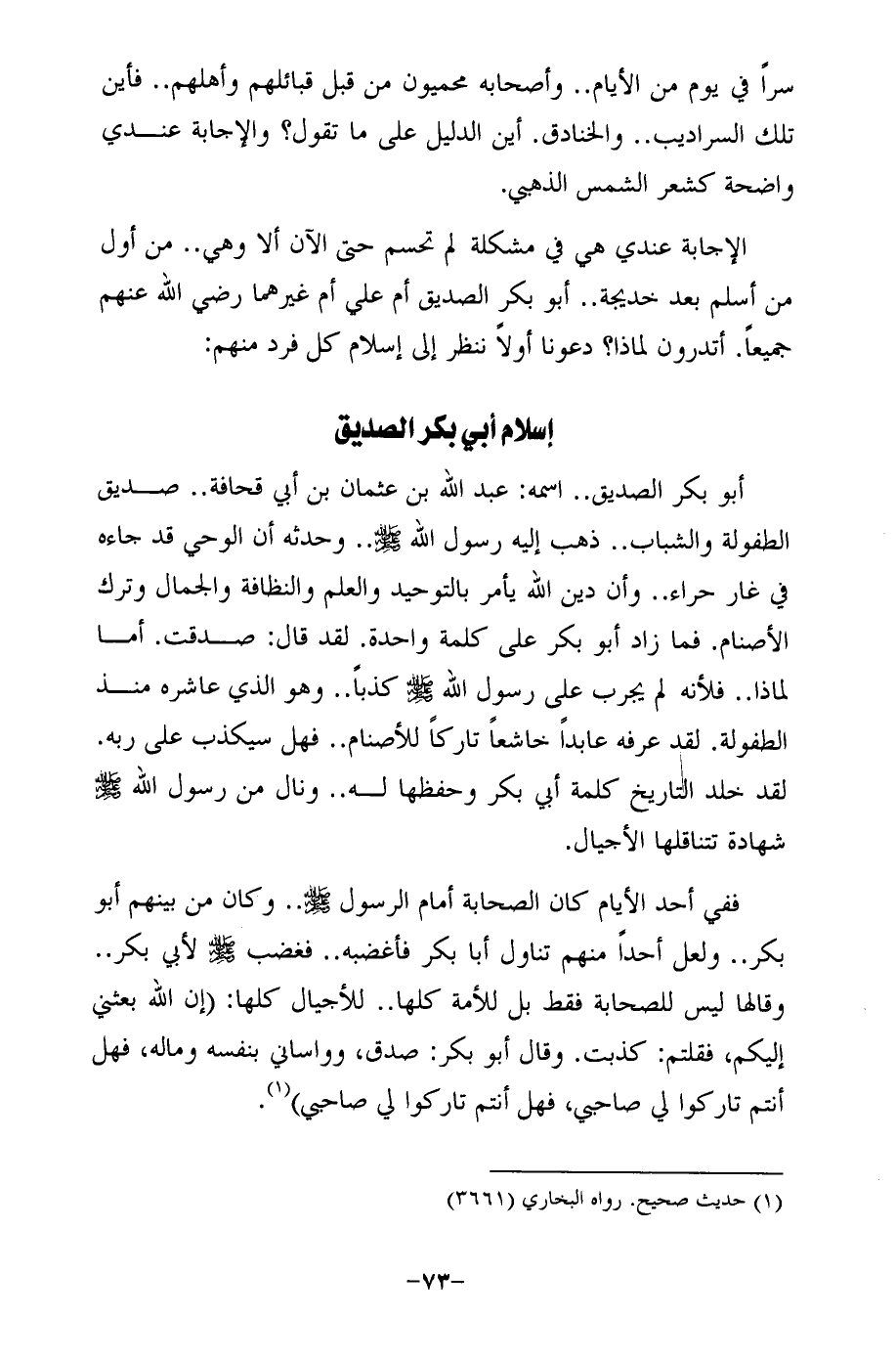 ففي أحد الأيام كان الصحابة أمام الرسول -صلى الله عليه وسلم- .. وكان من بينهم أبو بكر .. ولعل أحدًا منهم تناول أبا بكر فأغضبه .. فغضب -صلى الله عليه وسلم- لأبي بكر .. وقالها ليس للصحابة فقط بل للأمة كلها .. للأجيال كلها: (إن الله بعثني إليكم، فقلتم: كذبت. وقال أبو بكر: صدق، وواساني بنفسه وماله، فهل أنتم تاركوا لي صاجي، فهل أنتم تاركوا لي صاجى) (¬1).