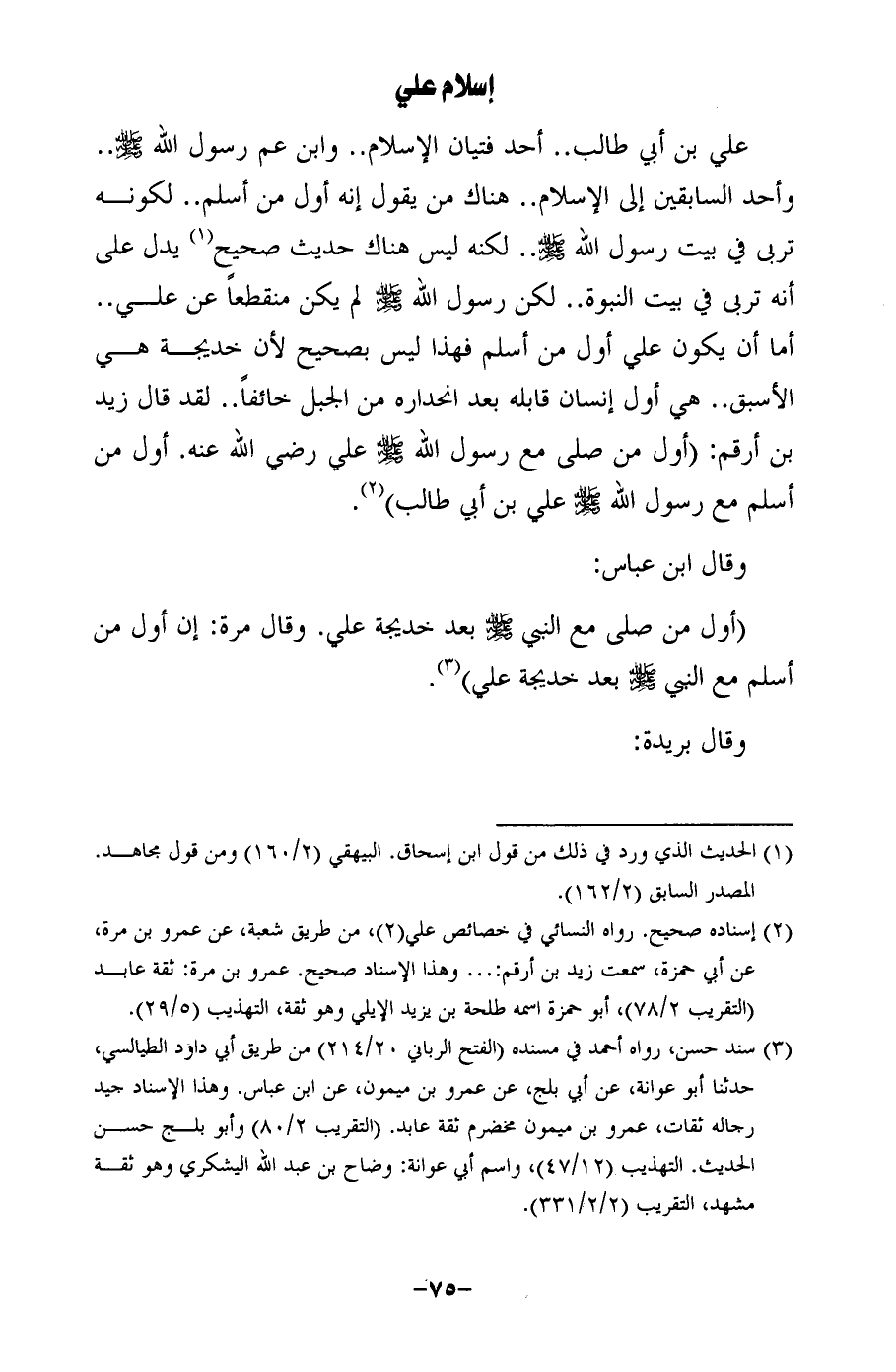 (أول من صلى مع النبى -صلى الله عليه وسلم- بعد خديجة علي. وقال مرة: إن أول من أسلم مع النبي-صلى الله عليه وسلم- بعد خديجة علي) (¬3).