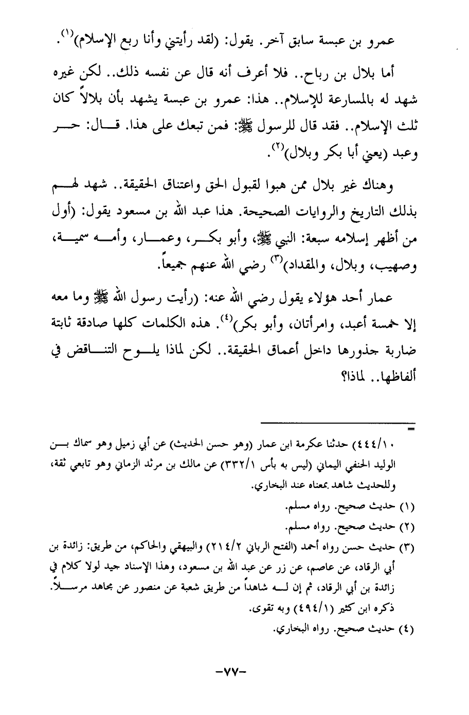 عمار أحد هؤلاء يقول رضي الله عنه: (رأيت رسول الله -صلى الله عليه وسلم- وما معه إلا خمسة أعبد، وامرأتان، وأبو بكر) (¬4). هذه الكلمات كلها صادقة ثابتة ضاربة جذورها داخل أعماق الحقيقة .. لكن لماذا يلوح التناقض في ألفاظها .. لماذا؟
