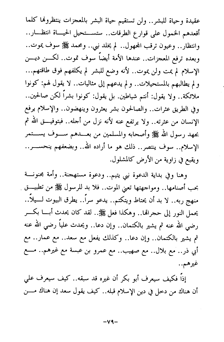 عقيدة وحياة للبشر .. ولن تستقيم حياة البشر بالمعجزات ينتظرونها كلما أقعدهم الخمول على قوارع الطرقات .. ستستحيل الحياة انتظار .. وانتظار .. وعيون ترقب المجهول .. لم يخلد نبي .. ومحمَّد-صلى الله عليه وسلم- سوف يموت .. وبعده ترفع المعجزات .. عندها الأمة أيضًا سوف تموت .. لكن دين الإِسلام لم يمت ولن يموت .. لأنه وضع للبشر لم يكلفهم فوق طاقتهم ... ولم يطالبهم بالمستحيلات .. ولم يدعهم إلى مثاليات .. لا يقول لهم: كونوا ملائكة .. ولا يقول: أنتم شياطن. بل يقول: كونوا بشرًا لكن صالحين .. وفي الطريق عثرات .. والصالحون بشر يعثرون وينهضون .. والإسلام يرفع الإنسان من عثرته .. ولا يرتفع عنه لأنه نزل من أجله .. فبتوفيق الله ثم بجهد رسول الله -صلى الله عليه وسلم- وأصحابه والمسلمين من بعدهم سوف يستمر الإسلام .. سوف ينتصر .. ذلك هو ما أراده الله .. وبضعفهم ينحسر .. ويقبع في زاوية من الأرض كالمشلول.